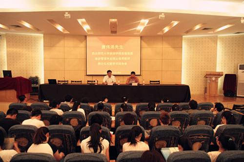 6月14日下午,公司客座教授聘任仪式暨《“中国西北游出发在兰州”谈做大做强兰州旅游》学术报告会在图书馆1楼学术报告厅举行。兰州市旅游局党组书记、局长唐伟尧,公司党委书记贾志斌,副经理梁旺兵、高亚芳,兰州市旅游局负责同志及公司师生130余人参加了聘任仪式并聆听了报告。报告会由公司经理把多勋教授主持。
