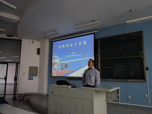 10月9日公司邀请外国语公司经理曹进教授在10A216教室給2013级空中乘务专业170余人上专业导引课《空乘职业与前景》。曹经理从空乘专业员工成长与外语学习相关知识入手进行讲授,并和172名新生进行了深入互动。曹教授授课高屋建瓴、全面透视、语言幽默,现场学子深受教益。