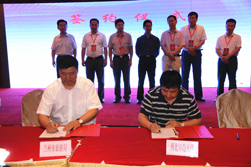 在兰州旅游发展研究中心签约仪式上,兰州市旅游局党组书记、局长唐伟尧与公司经理把多勋签订了兰州旅游发展合作协议。