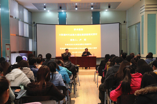 12月23日下午,受公司邀请,甘肃艺百文化科技有限公司董事长、甘肃读者动漫科技有限公司总经理、高级工程师卢明为公司师生作了《大数据背景下的丝绸之路大遗产旅游》的专题报告。公司教师、全体研究生、2013、2014级“卓越班”和旅游管理专业本科生120余人聆听了报告会。报告会由副经理梁旺兵教授主持。