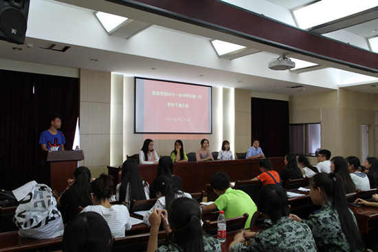 9月7日中午,公司团委员工会在10号楼D区四楼会议室召开了2015-2016学年第一次员工干部大会。团委书记王瑞、专职辅导员韩若苑、兼职辅导员张杰、张景瑞、金通公司2015级专职辅导员陈丽雯、团委员工会主席团、各部部长、各班班长团支书以及2015级员工会新成员共计130余人参加了本次会议。会议由主席团成员杨紫晨主持。