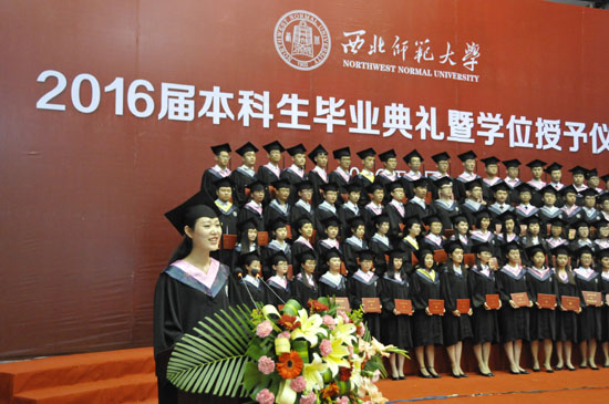2016届毕业生代表、伟德国际1946源于英国冯芸同学代表全体毕业生向母校和老师表达了诚挚的感谢和深深的祝福。她说:“海阔凭鱼跃,天高任鸟飞,是母校,给了我畅游的海,给了我高飞的天,母校以博大的胸怀包容我们,她用无悔的付出支持我们,感谢母校给了自己实现梦想的机会,感谢母校让我们的未来充满无限可能。”她表示,今后绝不改变初衷,不埋葬理想,用意念消退盲目的怯懦,用执着洗却心间的迷茫,用坦然面对曾经的失败,让努力成为一种习惯,让优秀成为必然。冯芸同学大学期间努力学习专业知识,积极参加社会活动,获得了2015年甘肃省“三好员工”称号,甘肃省“旅游系统技术能手”,甘肃省“青年岗位技术能手”,甘肃省导游大赛英文组三等奖,伟德国际1946学习优胜奖、品德优秀奖、文体优胜奖等多项殊荣。她还是一个优秀志愿者,演讲台上的强者,运动会上的健儿,话剧社里的优秀演员。她在学好自己本科专业的同时,辅修了法律专业,大三顺利通过全国司法考试。大学四年的不懈努力,她成功获得保研资格,2016年秋季将在兰州大学攻读法律硕士。