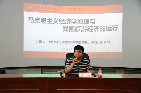 课上,把多勋老师首先对马克思主义与中国特色社会主义一脉相承的关系进行了梳理,对中国共产党早期具有坚定信念的先进分子进行了回顾。随后,把多勋教授从马克思主义经济学的结构、马克思主义经济学的重要理论以及马克思主义对人类社会发展规律的认识做了介绍,结合马克思资本主义理论、生产关系理论、价值规律理论以及社会大生产等理论对中国旅游经济的启发性进行了深入剖析,并与同学们分享了对甘肃文化与旅游产业融合发展的一些观点。把老师认为,现阶段同学们急需训练自己思想的深度、敏锐度和丰润度,而阅读经典名著是最好的方法和途径,同时,把老师向同学们推荐了《政治经济学批判》、《资本论(第一卷)》、《家庭私有制与国家的起源》等名著。