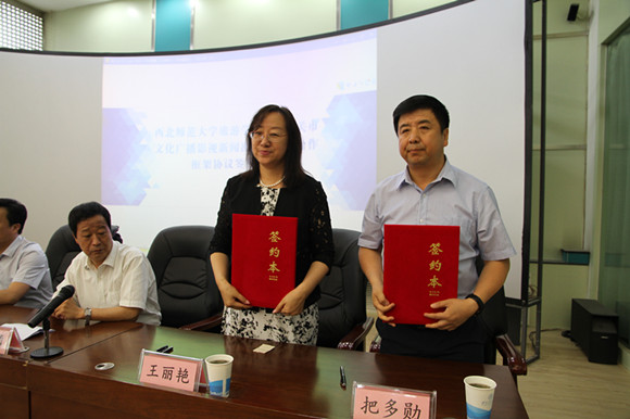 嘉峪关市文广新局局长王丽艳同志与公司经理把多勋教授代表双方签约。
