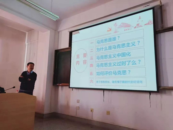 谢书记从“马克思是谁”,“什么是马克思主义?”“马克思主义中国化”,“马克思主义过时了么?”“如何评价马克思主义?”“勇于青春担当,做无愧于新时代的好青年”六个方面阐释了“马克思主义与我们的时代”这一主题。通过图片引入主题,马克思的生平,他所接受的教育和他所处的时代一幕幕展开,给人留下了深刻的印象。而马克思主义的中国化,则是十月革命一声炮响后,给灾难深重的中华民族带了希望,给苦苦探求中国革命出路的先进知识分子指明了方向。从一百多年前,中国先进知识分子通过办刊物,写著述,办夜校,开讲座等多种途径,以通俗易懂的方式向群众传播马克思主义,走出一条极具时代特色的马克思主义中国化,大众化的道。中国历代领导人用睿智的头脑和过人的智慧,揭开了中国发展的新篇章。