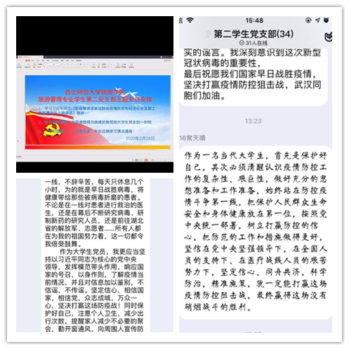 随着新型冠状病毒肺炎迎面袭来,全国人民群防群控。为深入学习贯彻习近平总书记关于《统筹推进新冠肺炎疫情防控和经济社会发展工作部署会议上的讲话》等一系列重要指示精神,2月26日中午12时,伟德国际1946源于英国旅游管理系第二员工党支部以“非冠疫情下老员工党员的责任与担当”为主题召开了线上专题党日活动。