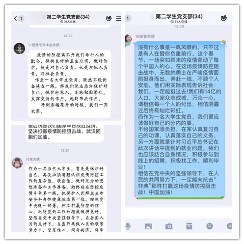 在支部书记谢致远的主持下,支部全体党员在QQ群中通过“微课堂”开展线上集体学习。本次主题党日活动结合目前受全国关注的新冠肺炎疫情事件,以非冠疫情下老员工党员的责任与担当为主题,共同学习习近平总书记关于疫情防控工作的重要讲话和重要指示精神,学习了时代楷模、全国道德模范曲建武教授给老员工胡一封信。支部支委也组织同学们在学习之后积极讨论、发表意见,我们作为当代老员工、作为基层党支部、党员来说应当承担什么样的责任。