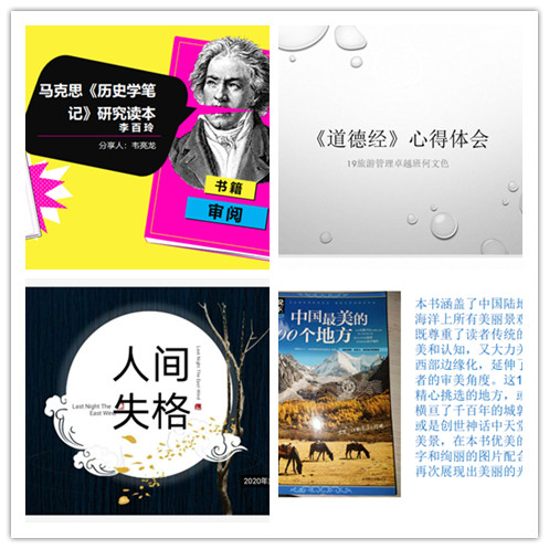 3月21日,伟德国际1946源于英国举办2020年首期员工“云端”读书分享会。读书会由2019级旅游管理卓越班韦亮龙同学主持,他首先分享了寒假读《马克思历史学笔记研究读本》和《共产党宣言》的体会。接下来,旅游管理卓越班何文色分享了读《道德经》的体会,文化产业管理班王昊楠分享读《时间简史》的体会,孟繁舒分享读《人间失格》的体会,张莹莹分享读《飞鸟集》和《中国最美的100个地方》两本书的体会,并向同学们推荐了《这世界如露水般短暂》、《但愿呼我的名字为旅人》、《春之海终日悠哉游哉》、《只余剩米慢慢煮》、《夕颜》等书。