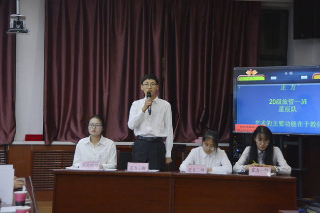 本次角逐决赛的四支队伍分别是来自20级航空服务艺术与管理二班的小朋友爱吃糖队、文化产业管理班的一爻乾坤队、旅游管理一班的星辰队和旅游管理三班的灵辩队,决赛分为两场进行。在上半场的比赛中,来自旅游管理一班的星辰队和旅游管理三班的灵辩队两支队伍就辩题“艺术的功能在于教育还是娱乐”进行了季军的角逐,以反方二辩黄海滨辩手的质询和对辨最为出彩。上半场比赛结束之后,鲁梦鸽老师对双方辩手的现场表现给与肯定并对辩论中双方选手存在的问题结合“听鉴•思辨”这一主题提出希望选手能够通过会听、会鉴别、会思考最终机智的辩论。紧接着在下半场的比赛中,来自航空服务艺术与管理二班的小朋友爱吃糖正方代表队和来自文化产业管理班的一爻乾坤反方代表队两支队伍针对辩题“情在理先还是理在情先”展开唇枪舌战,尤其在自由辩论环节双方你来我往、引经据典、思维缜密、场面尤为精彩,两队实力不相上下,最后在评委的商议打分后,以小朋友爱吃糖代表队获胜为结局完美收官,李芃君老师和苗馨月老师对每位选手的逻辑思维、语言表达、临场反应都做出了细致的点评,并对表现欠佳的队伍和辩手进行了鼓励与支持。