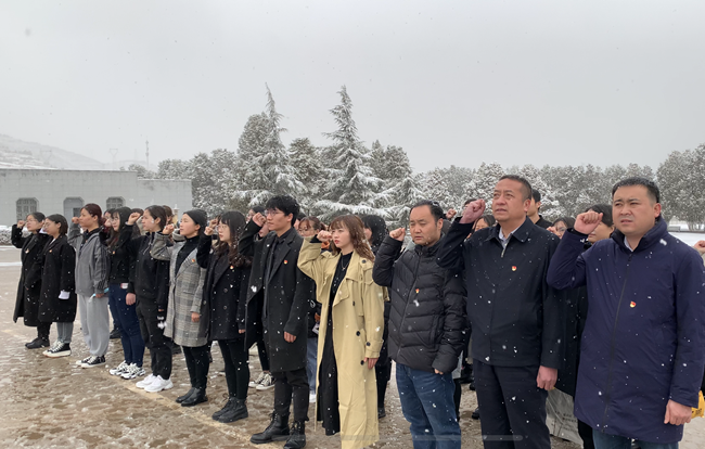 国歌毕,全场肃立、垂首、默哀,深切缅怀革命烈士的丰功伟绩和不朽功勋。在深情庄重的《献花曲》中,礼兵手托花篮,正步向前、拾阶而上,缓缓将花篮摆放在纪念碑前。随后,在员工党员代表的引领下,全体党员面向人民英雄纪念碑,庄严举起右拳,重温入党宣誓词,场面庄严而肃穆。