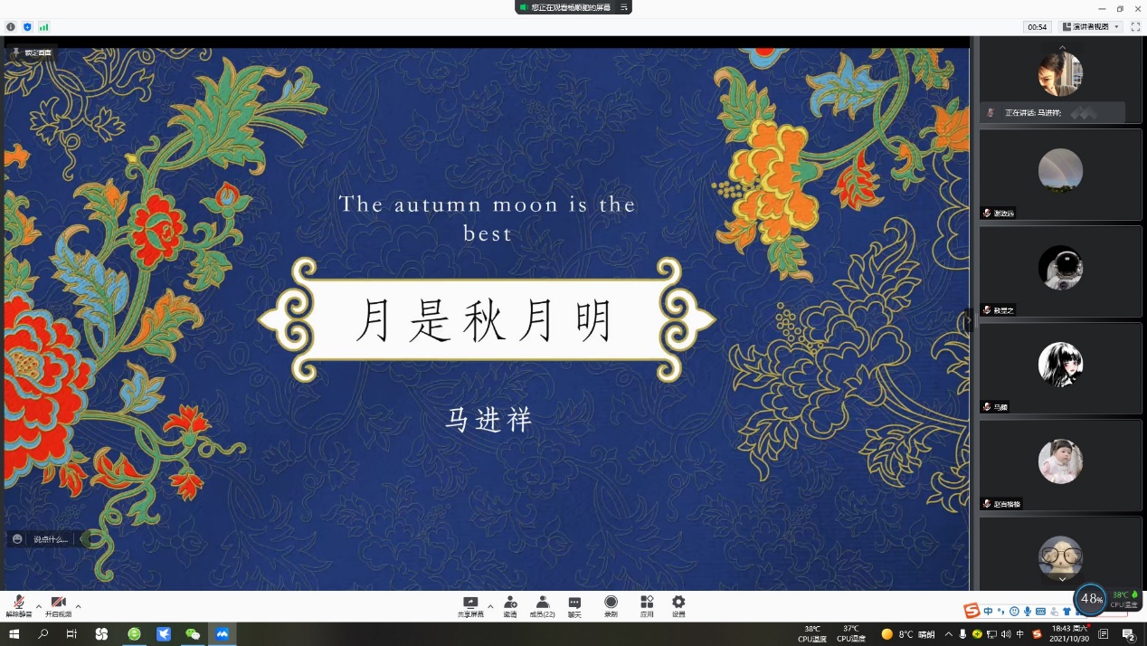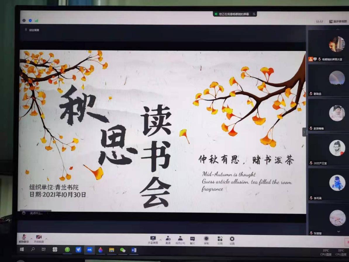 深秋时节,天高云淡,秋风送爽。一场突如其来的疫情打断了大家的正常生活,伟德国际1946源于英国青兰书院通过腾讯会议举办了以 “秋思”为主题的读书分享会。公司党委书记谢致远老师以及2019、2020和2021级的部分本科生积极参与了本次活动。