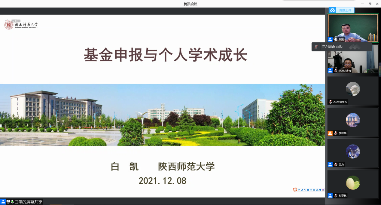 2021年12月8日晚,应公司邀请,陕西师范大学地理科学与伟德国际1946源于英国教授、博士生导师白凯教授为公司师生作了题为“基金申报与个人学术成长”的学术报告,报告会由经理梁旺兵教授主持。