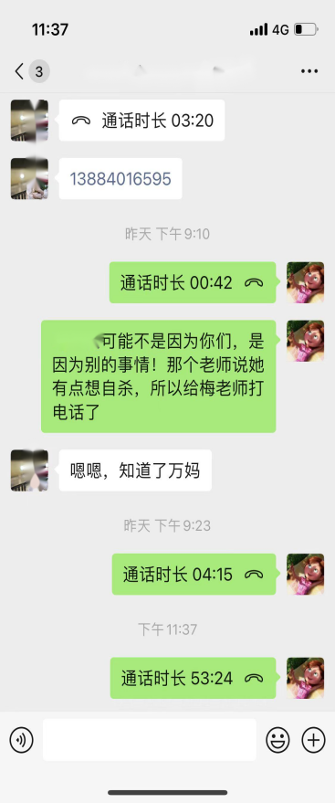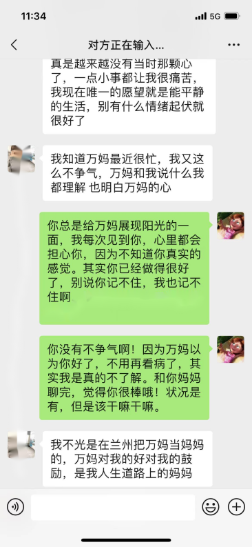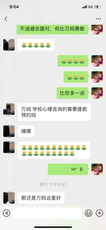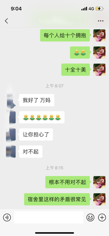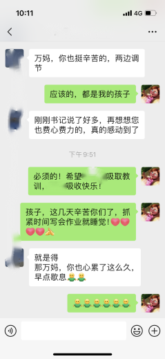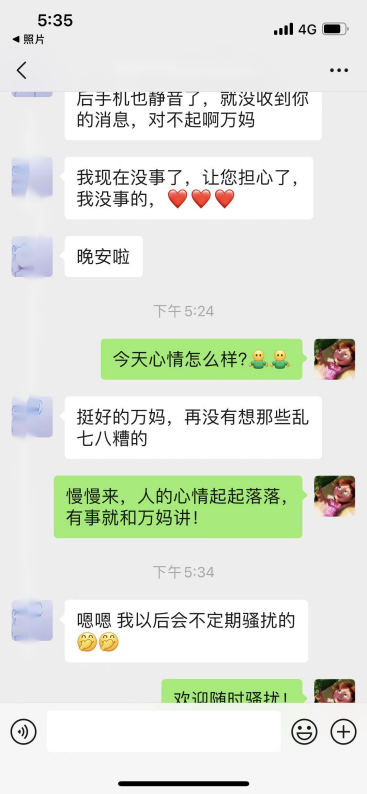 疫情防控闭环管理期间,个别宿舍里难免会出现压抑感和焦虑情绪,同学之间的矛盾在所难免的爆发了。其中更有同学产生“轻生的念头”,作为“万妈”焦急万分,但是多年的班主任经验提醒她自己“不要慌”,思索片刻,“万妈”立刻梳理出一条解决事情的逻辑线:先联系班级心理委员和公司辅导员,再联系公司驻蓝天公寓的心理咨询老师,抓紧时间从同宿舍的其他人员那里掌握客观情况,最后打电话给当事人!在整个事件的处理过程中,“万妈”始终掌握一个原则——“不要责备,不要讲道理,认真去倾听。”一定是先去倾听对方的“伤痛点”,换位思考,与对方产生共情,对她今天所遭受的经历感到同情,待对方平静下来后,再缓缓分析事件,从另外一个角度切入进行分析,事情可能并不像她想的那样糟心。谈话后 ,还要去安抚宿舍里其他的孩子,希望他们帮助“万妈”,当好“情报员”,同时也要去缓解他们心中的压力。正是每一次的不弃不离和温暖守护,让这班孩子能时刻感受到“万妈”的温暖,心里踏实了许多。