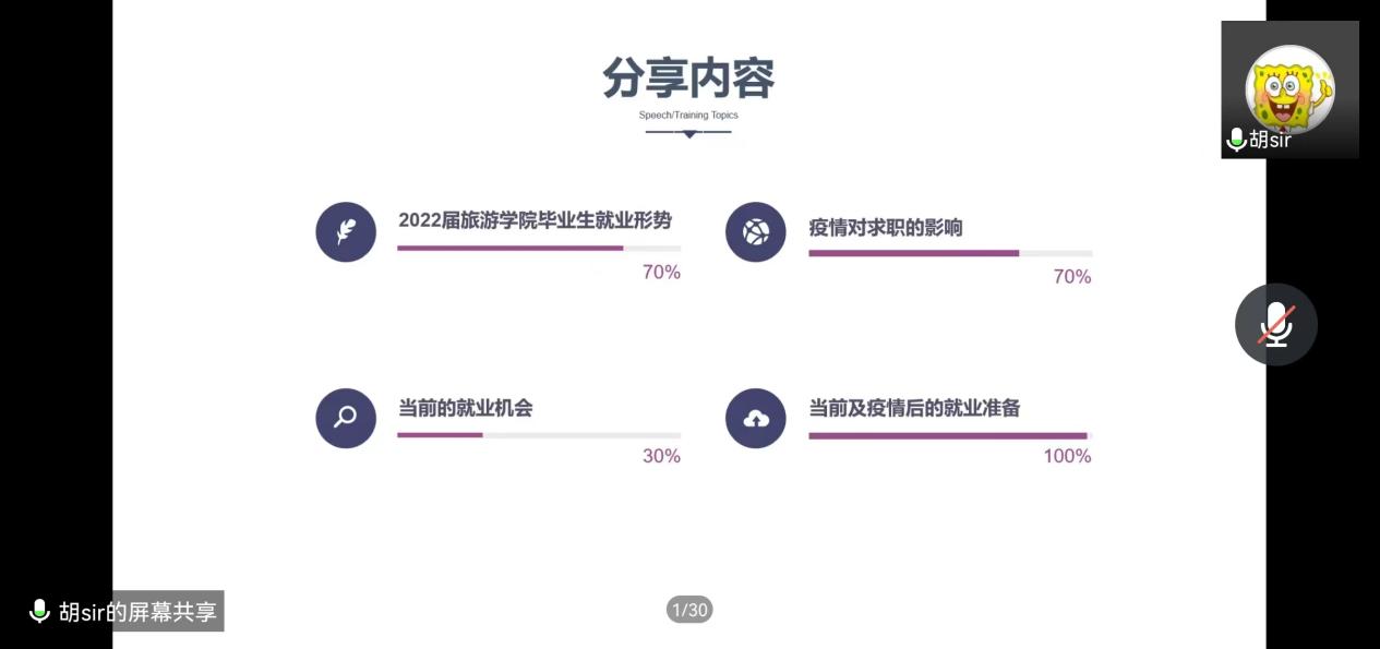 集团人才招聘处胡炜老师用往届旅游管理、酒店管理等专业同期就业数据及就业工作中的典型案例,客观的从多个角度为毕业生分析当前2022届毕业生就业、升学的进度和不同形势。并以多年从事就业工作的专业角度重点解读了疫情对求职的影响、疫情影响下的就业机会和挑战、当前及疫情后的就业准备。