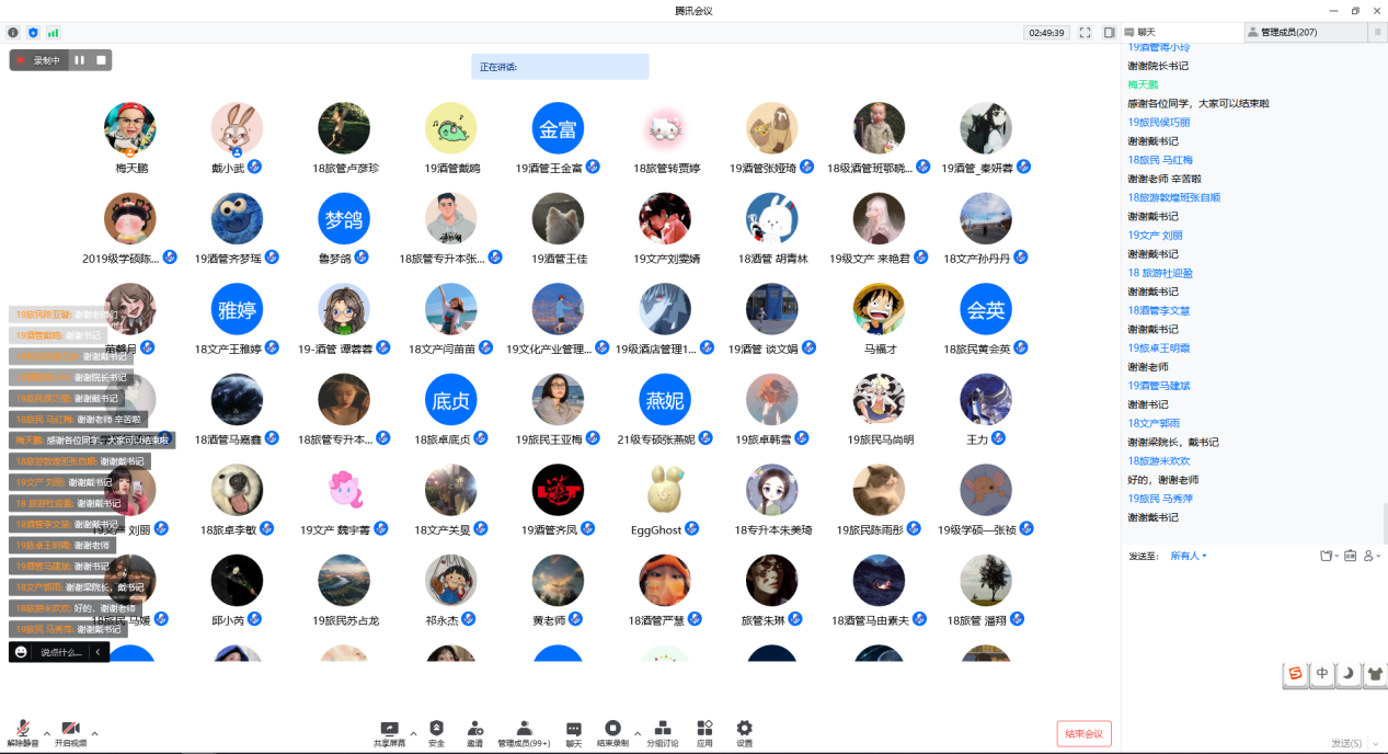 交流研讨环节,同学们热情高涨,语音弹幕目不暇接,2022届旅游管理硕士毕业生张祯、2019级旅游管理卓越班李一鑫分别从网签系统签约违约金事宜和老员工就业如何处理好个人求职与家庭选择之间的矛盾这两个问题展开交流,胡炜老师的耐心解答不仅消除了同学们心中的疑惑,也让更多与会毕业生感受颇多,受益匪浅。零距离的沟通,心与心的交流,既提高了毕业生求职就业的应变能力,又有利于帮助毕业生自信地坚定未来职业生涯发展目标,更有自信地轻松走向职场。