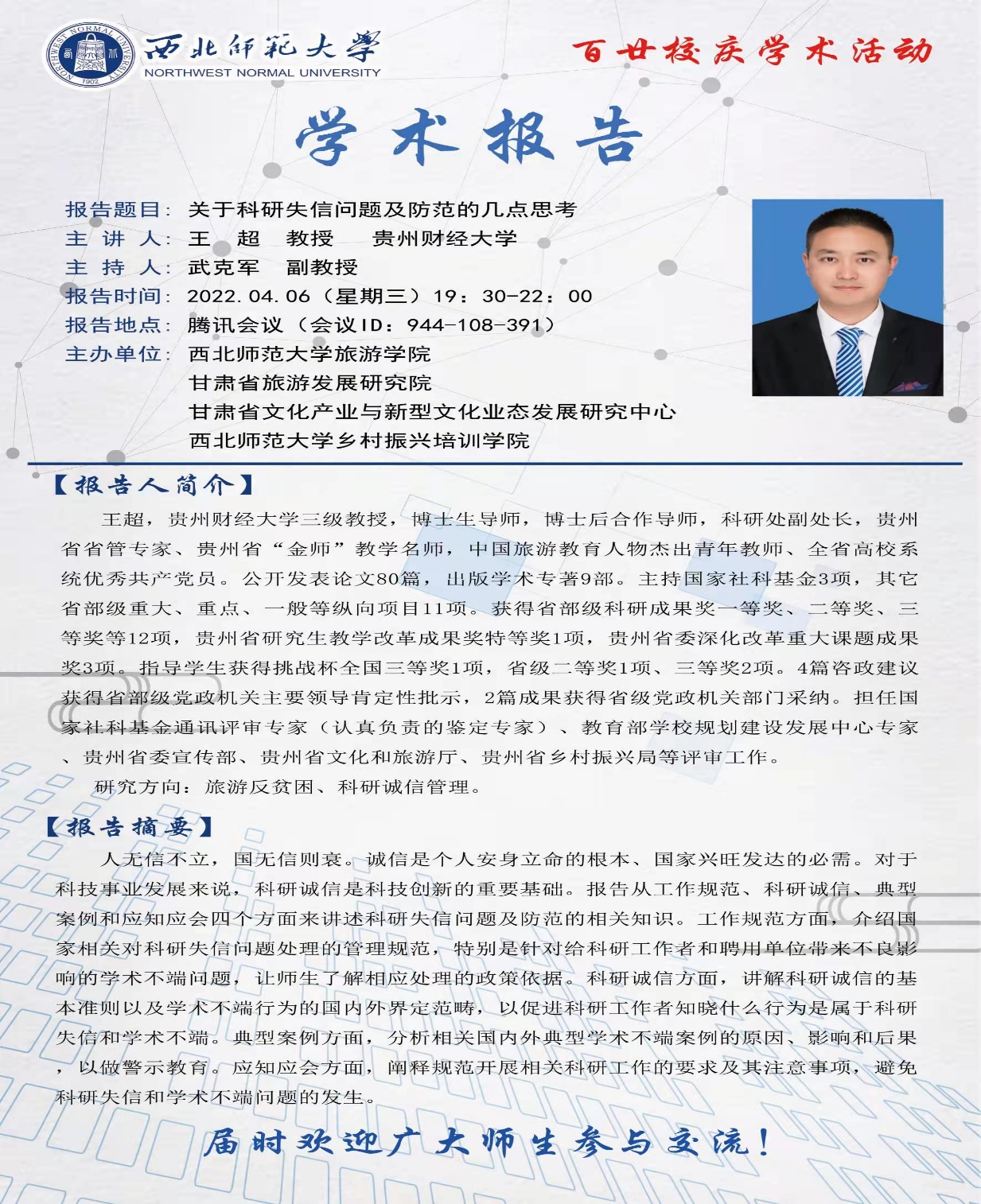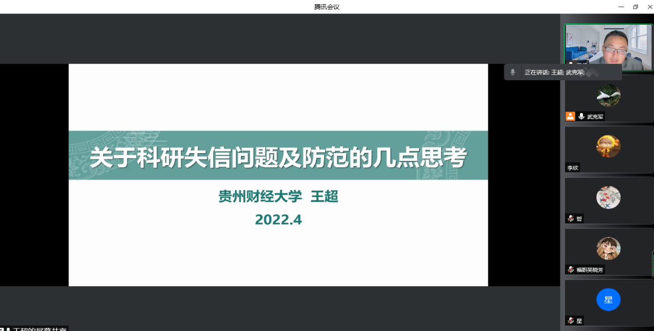 2022年4月6日晚上,应公司邀请,贵州财经大学三级教授、博士生导师、科研处副处长王超教授为公司师生作了题为“关于科研失信问题及防范的几点思考”的学术报告,报告由武克军副经理主持,公司师生约165人参加了报告会。