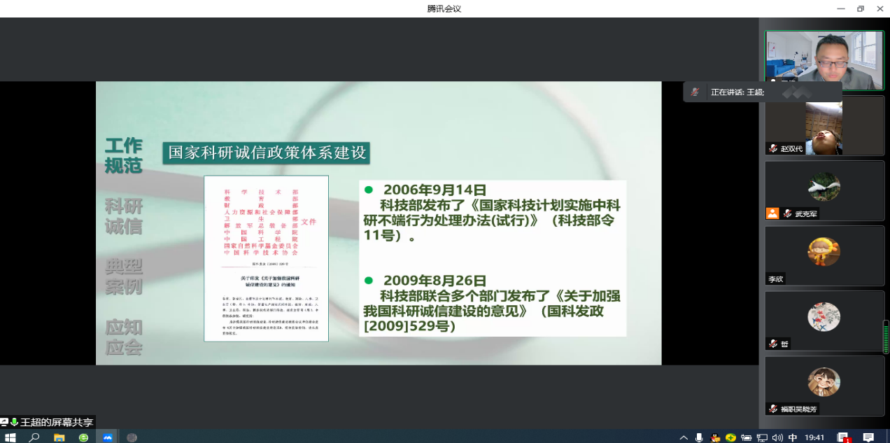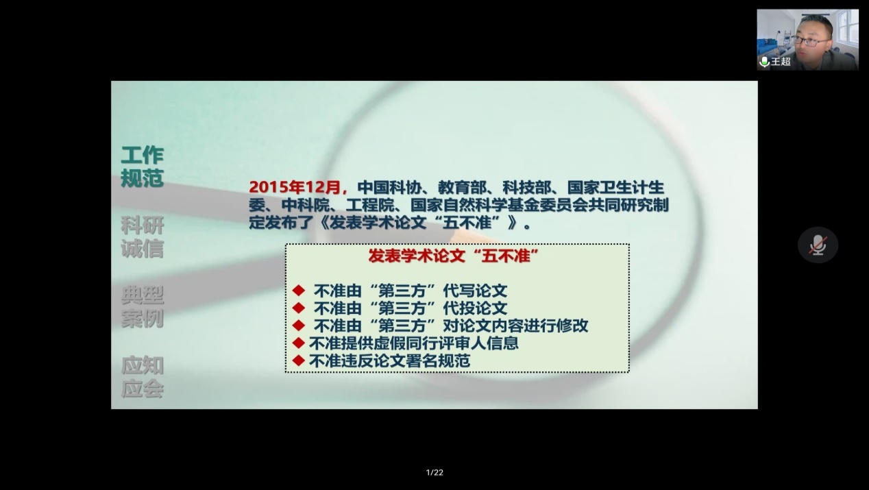 报告会上,王超教授从工作规范、科研诚信、典型案例和应知应会四个方面展开自己的讲解。工作规范方面,王超教授介绍了我国最近几年发布的各种规章制度以及国家对于科研失信问题处理的管理规范,让员工们能够根据政策处理相关的问题。科研诚信方面,王超教授从中国科协公布的科技工作者调查报告出发,讲解了科研诚信的基本准则和国内外对于学术不端行为的界定范畴,区别了科研失信和学术不端。典型案例方面,王超教授通过分析国内外学术不端的典型案例,给员工和老师做了警示教育。应知应会方面,王超教授细致分析了学术规范等相关工作,包括基本准则、查新和项目申请规范、项目实施规范、论文发表规范、论文发表后续工作规范以及人及试验动物研究对象规范,阐释了规范开展相关工作的要求和注意事项。