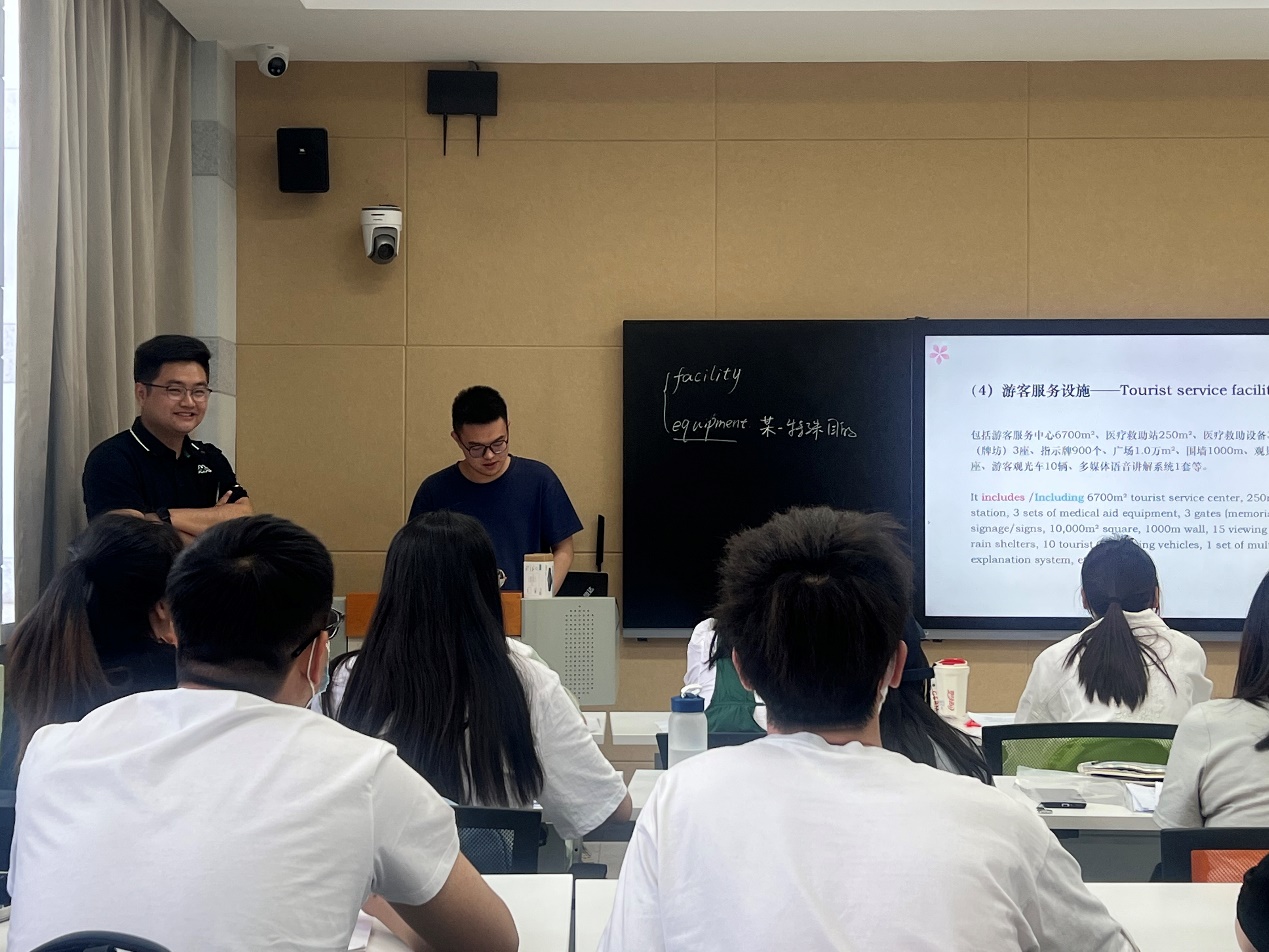 包军军博士在教学过程中以“甘肃省世界银行贷款自然文化遗产保护与开发项目”文本为基础,将旅游规划与开发理论和英文翻译实践相结合,引导员工将多门专业课程中所学知识融会贯通并在中英文项目文件中活学活用,注重训练员工在现代信息技术辅助下专业英语的表达能力。课堂上,包军军老师教态自然大方、讲授声情并茂、语言风趣幽默,营造出严谨而又不失活泼的课堂气氛。员工学习热情高涨,能够与授课教师充分互动,轻松愉快地完成学习任务、达成学习目标,这反映出包军军老师扎实的教学功底和丰富的教学技巧。