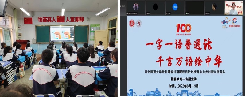 8月28日,实践团队通过线上云宣讲的方式为甘南藏族自治州卓尼县柳林中学的高中员工开展《一字一语普通话·千言万语绘中华》推广普通话专题宣讲,宣讲团成员石春杨同学针对气息训练、发音训练、字词断句等方面准备了特色课程。通过典型示范,与同学们在线上面对面互动诵读,并针对发音中容易出现的错误问题进行简要分析,给予同学们正确的示范反馈,对于同学们今后讲好普通话具有良好的教学示范作用。