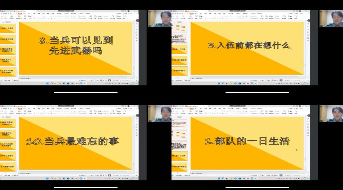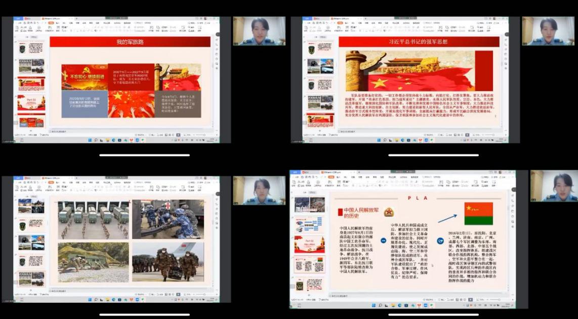 会上,高玮轩从国防常识、中国人民解放军、我的军旅生涯以及老员工入伍的相关政策四方面进行宣讲。通过视频、图片等方式普及国防知识,详述了中国人民解放军的发展历史,让同学们对陆海空军、火箭军、战略支援部队以及联勤保障部队等军种有了一定的认识和了解。