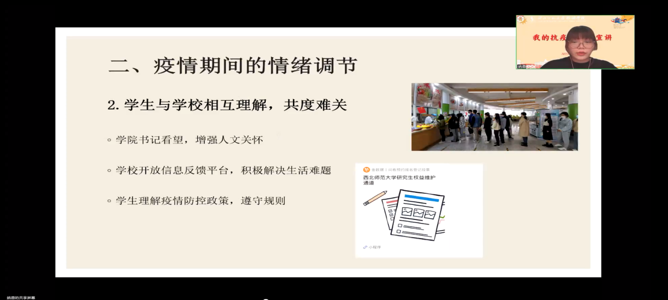 疫情当前,吾辈当自强;抗击疫情,青年勇担当。整个宣讲活动增强了同学们对抗疫的信心,点燃了对志愿工作的热情,参会同学积极连麦互动,纷纷表示在疫情面前没有旁观者,大家都是责任人,我们一定要共克时艰,同舟共济,努力做时代变局的清醒者、奉献者、奋斗者,用心书写共抗疫情、共同奋斗的青春之歌。
