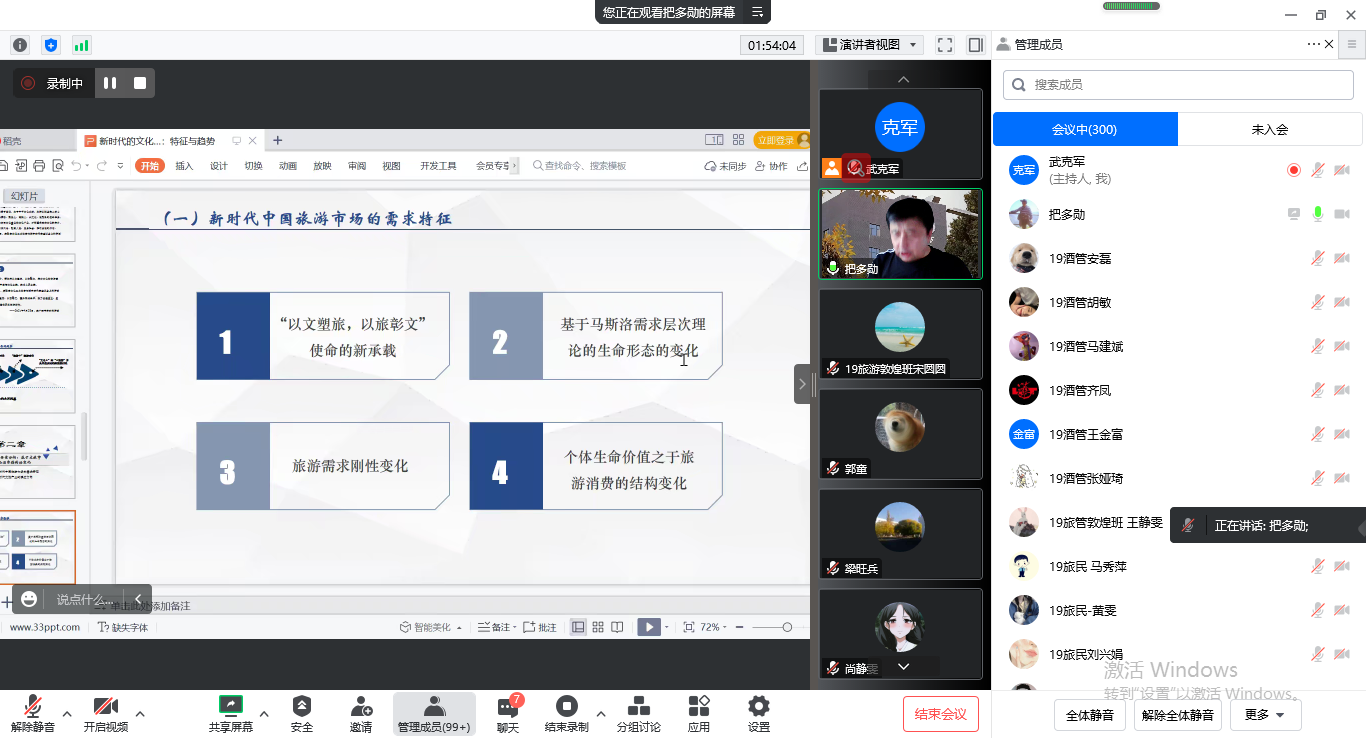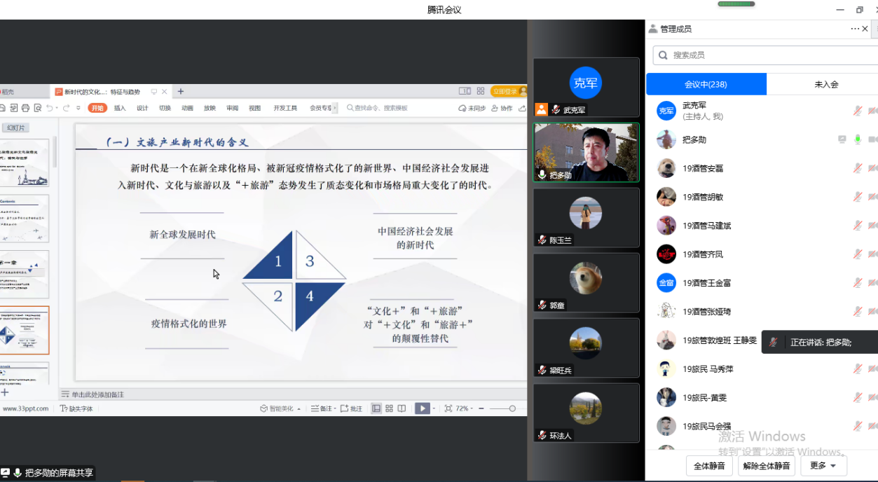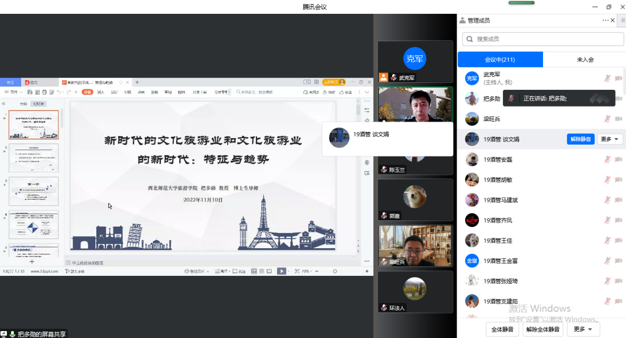 2022年11月10日下午,把多勋教授在线为公司师生做《新时代的文化旅游业和文化旅游业的新时代:特征与趋势》的学术报告。报告由梁旺兵经理主持,伟德国际1946源于英国全院300多名师生参加了学习。