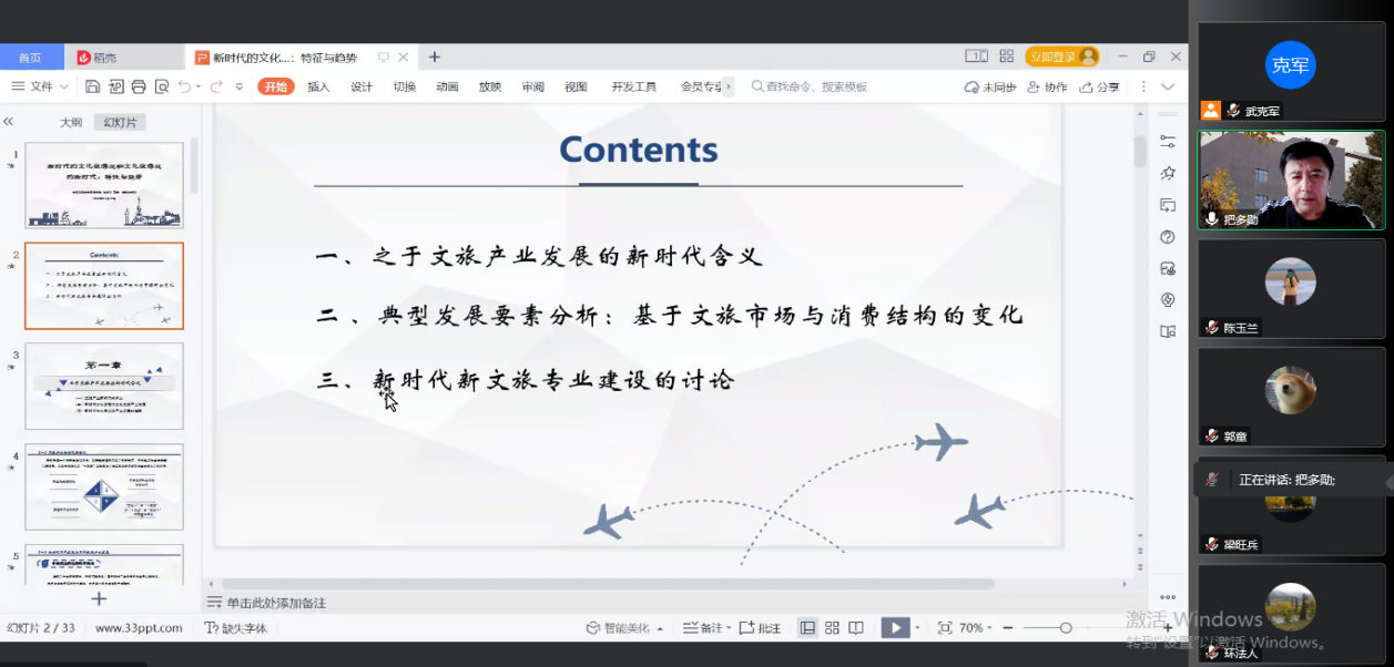 把多勋教授分别从文旅产业发展的新时代定义、新时代文化发展与文化旅游产业发展、新时代与未来文旅产业发展的趋势三个方面对会议主题发表自己的看法,认为文化产业和旅游产业密不可分,要坚持以文塑旅、以旅彰文,推动文化和旅游融合发展,让人们在领略自然之美中感悟文化之美,陶冶心灵之美,同时就新时代与未来文旅产业发展的趋势提出自己的意见和看法。