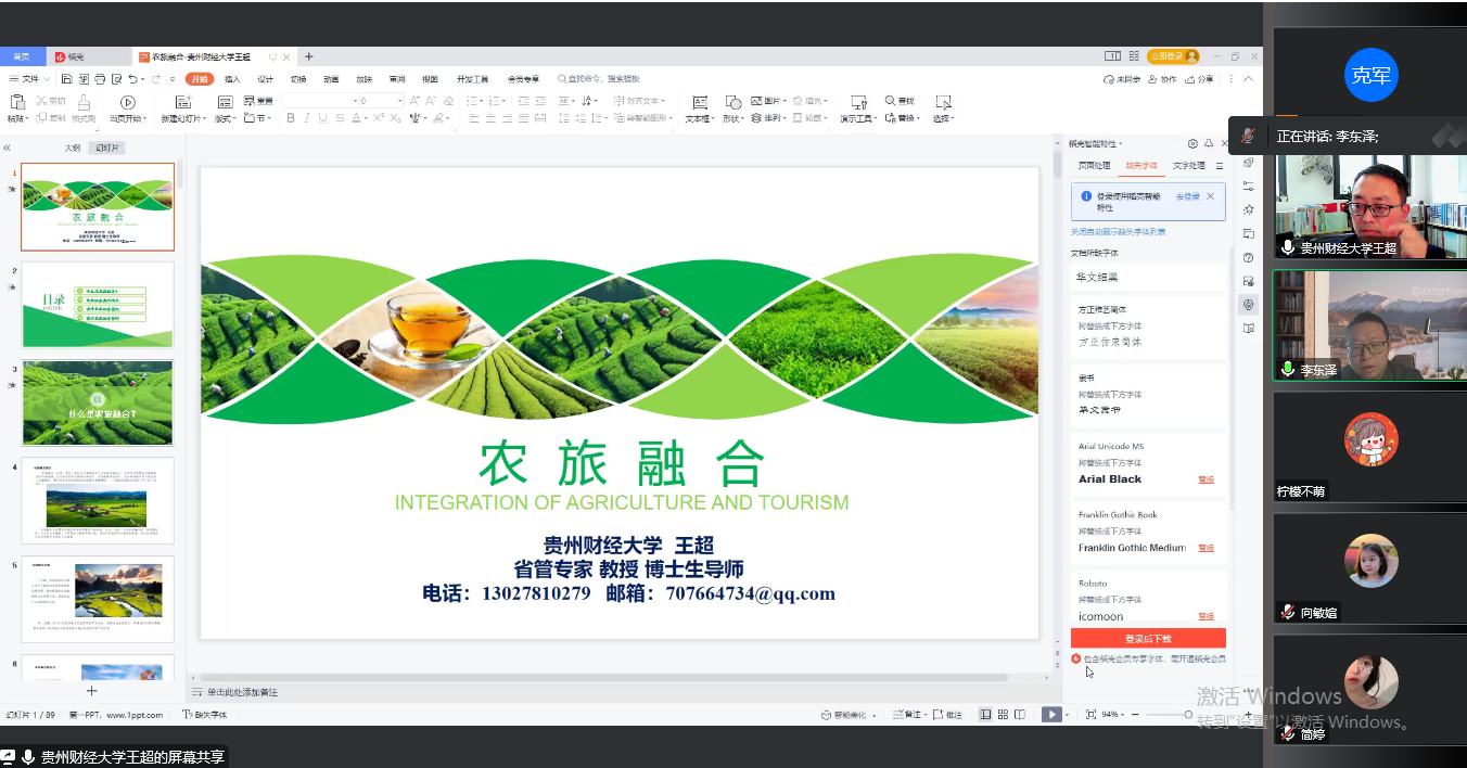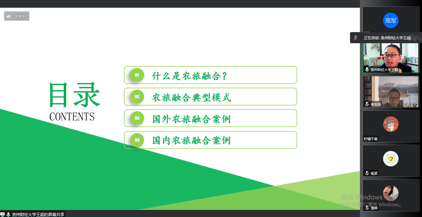 王超教授深入浅出,以贵州典型案例为切入点,分享了农旅融合(农旅一体化)是在充分尊重农业产业功能的基础上,合理开发利用农业旅游资源和土地资源,以所开发的农业旅游休闲项目、农业配套商业项目、农业旅游地产项目等为核心功能架构,整体服务品质较高的农业旅游休闲聚集区。(《全国休闲农业发展“十二五”规划》)。从国家对农旅融合的要求基础上,深入讨论农旅融合的田园农业旅游模式、科普教育旅游模式、村落小镇旅游模式、民俗风情旅游模式、回归自然旅游模式几种典型模式。基于典型模式,深入阐释无锡阳山东方、关中袁家村、达州生态产业园、日本富田农场、英国EDEN伊甸园、西班牙胡斯卡小镇等国内外案例实践,让老师和同学们在持续推进乡村振兴的时代背景下,充分了解旅游发展对巩固拓展脱贫攻坚成果和助力乡村产业振兴的责任担当,开拓发展乡村休闲旅游经济的思路。