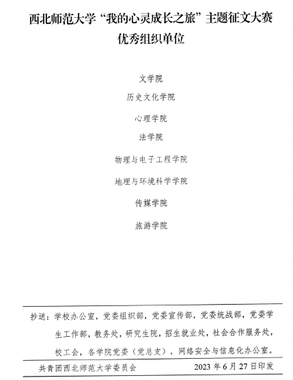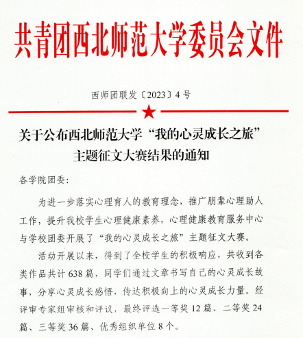 为进一步落实心理育人的教育理念,推广朋辈心理助人工作,提升公司员工心理健康素养,2023年4月15日-5月15日,公司团委与心理健康教育服务中心共同组织“我的心灵成长之旅”主题征文大赛,鼓励同学们书写自己的心灵成长故事,分享心灵成长感悟,传达积极向上的心灵成长力量。