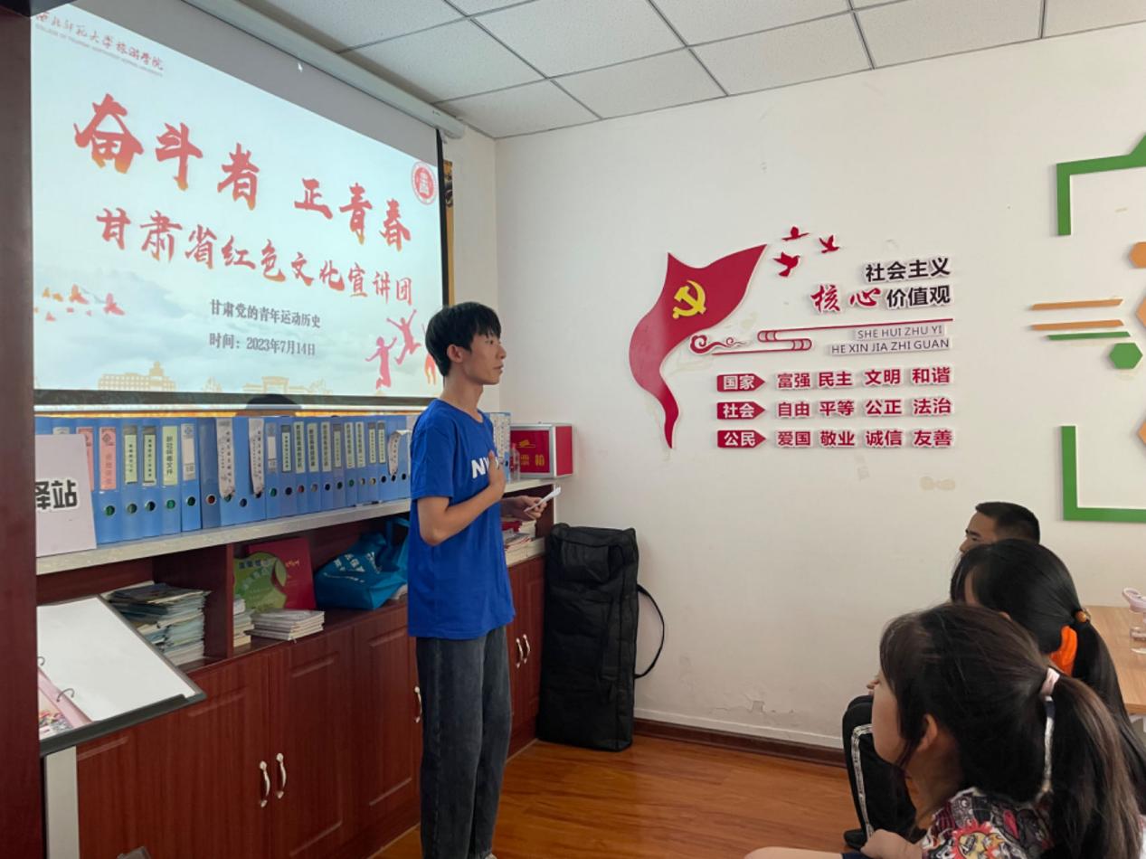 为进一步深入贯彻党的二十大精神,深刻领悟红色文化价值意蕴,提高甘肃省红色文化影响力,推动甘肃省红色文化创新性发展,让红色文化走进青年员工。2023年7月14日,“奋斗者 正青春”甘肃红色文化宣讲实践团走进师大社区向伟德国际1946附属中学的青年员工开展以甘肃党的青年运动历史为主要内容的甘肃省红色文化宣讲活动。让甘肃省红色文化在新征程上焕发时代光芒,让广大青年员工自觉传承革命精神、赓续红色血脉。