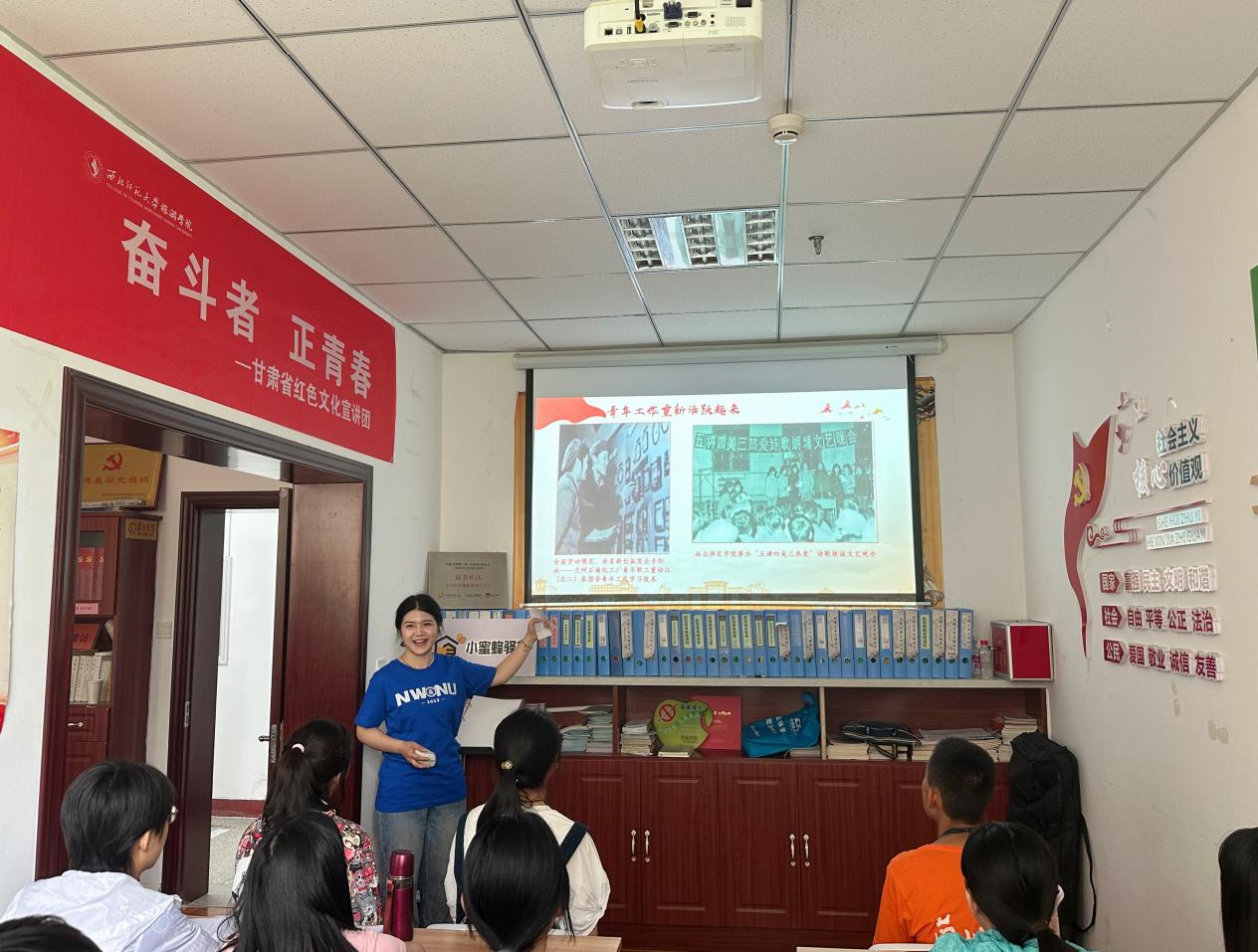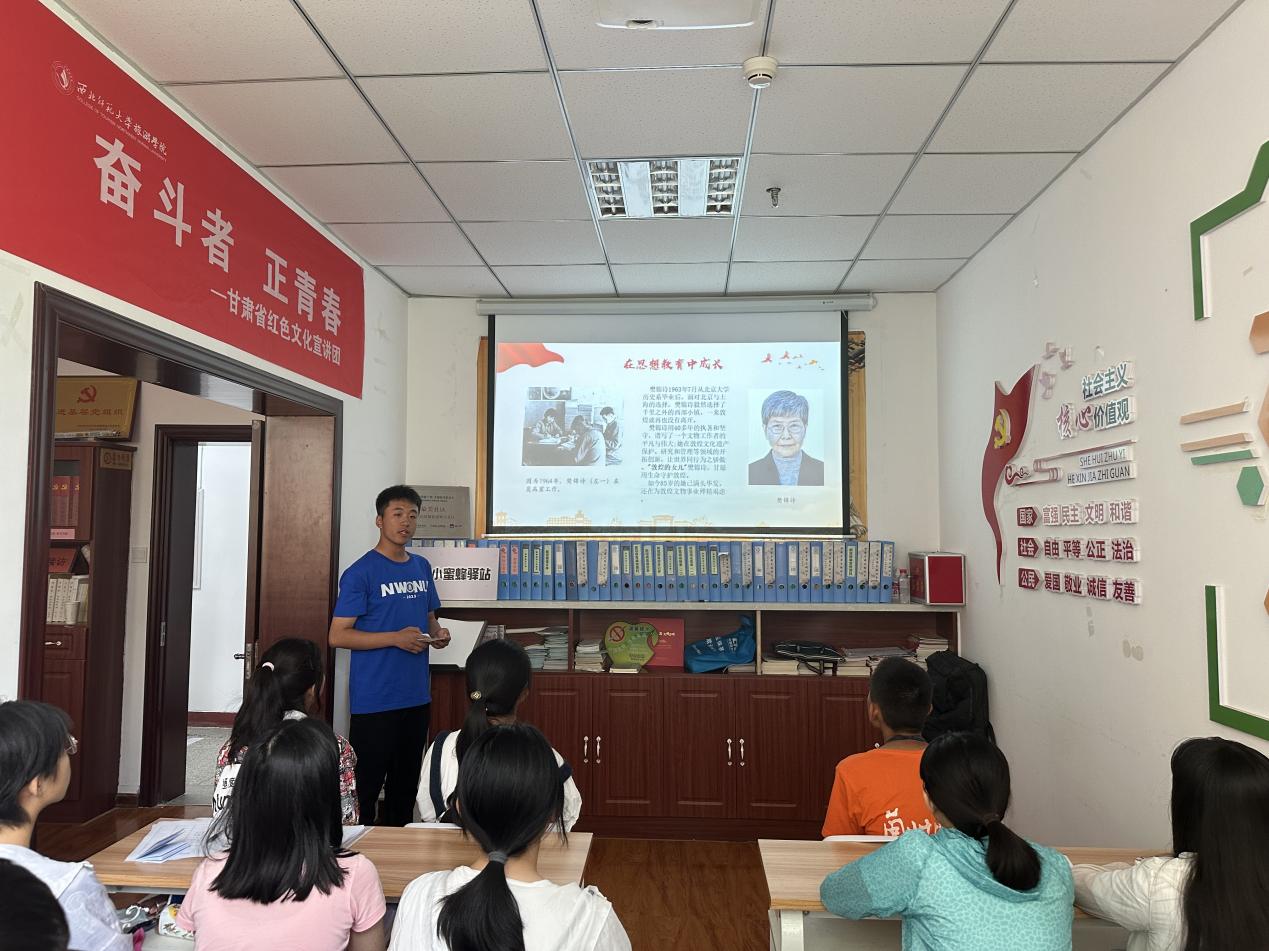 在第三个环节中,团队成员向同学们以分年代、分篇章的形式,将甘肃党的青年运动史分为四个篇章内容,时间跨度从1919年至2023年,集中讲述了在中国共产党的领导下甘肃青年跟随党打破旧时代到如今紧跟党奋进新时代的重大革命历史事件、革命精神、英雄人物事迹,系统总结中国共产党带领一代代甘肃青年在各个时期做出的历史贡献与重大意义。