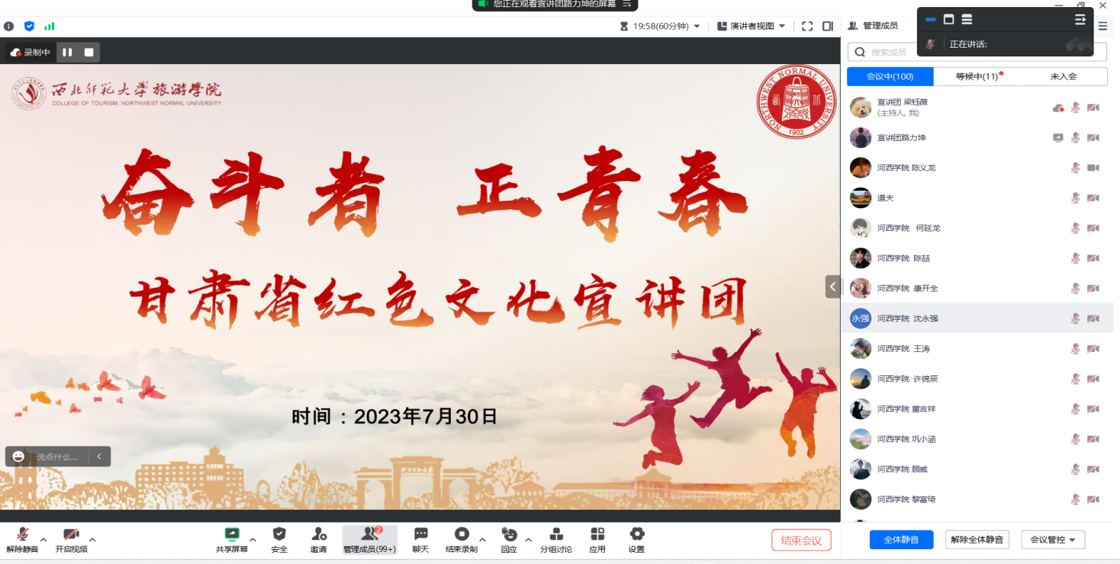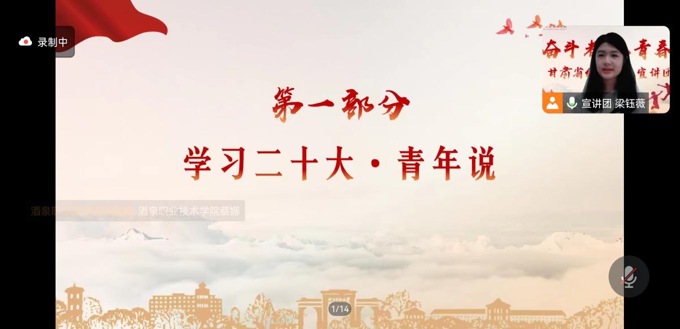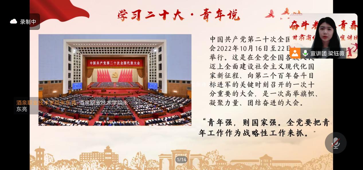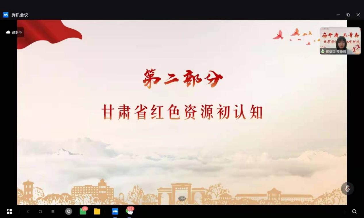 为深入学习贯彻党的二十大精神、提高甘肃青年对本省红色文化的认知,2023年7月30日,伟德国际1946源于英国“奋斗者 正青春”甘肃红色文化宣讲实践团面向河西公司和酒泉职业技术公司共160余名员工开展线上宣讲活动。宣讲内容包括学习二十大精神、甘肃红色资源认知、甘肃党的青年运动历史等。