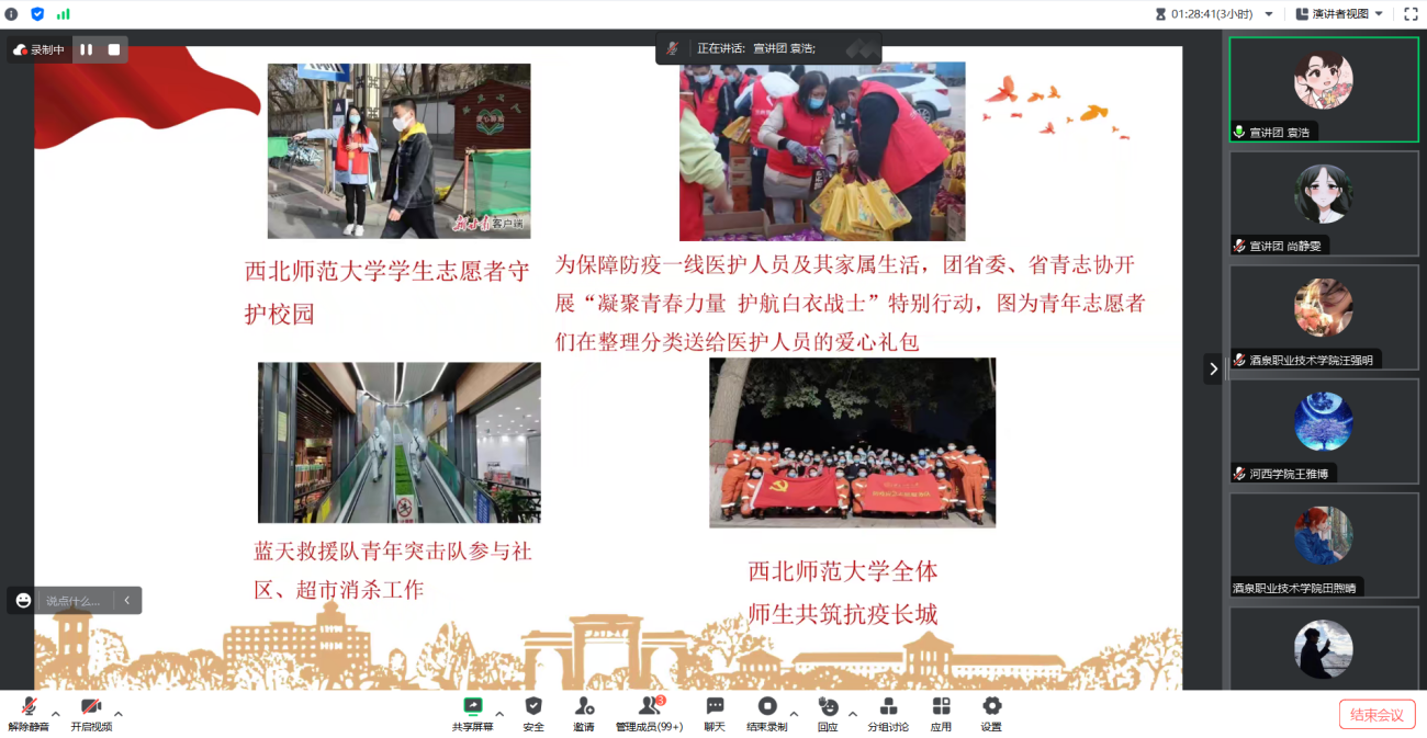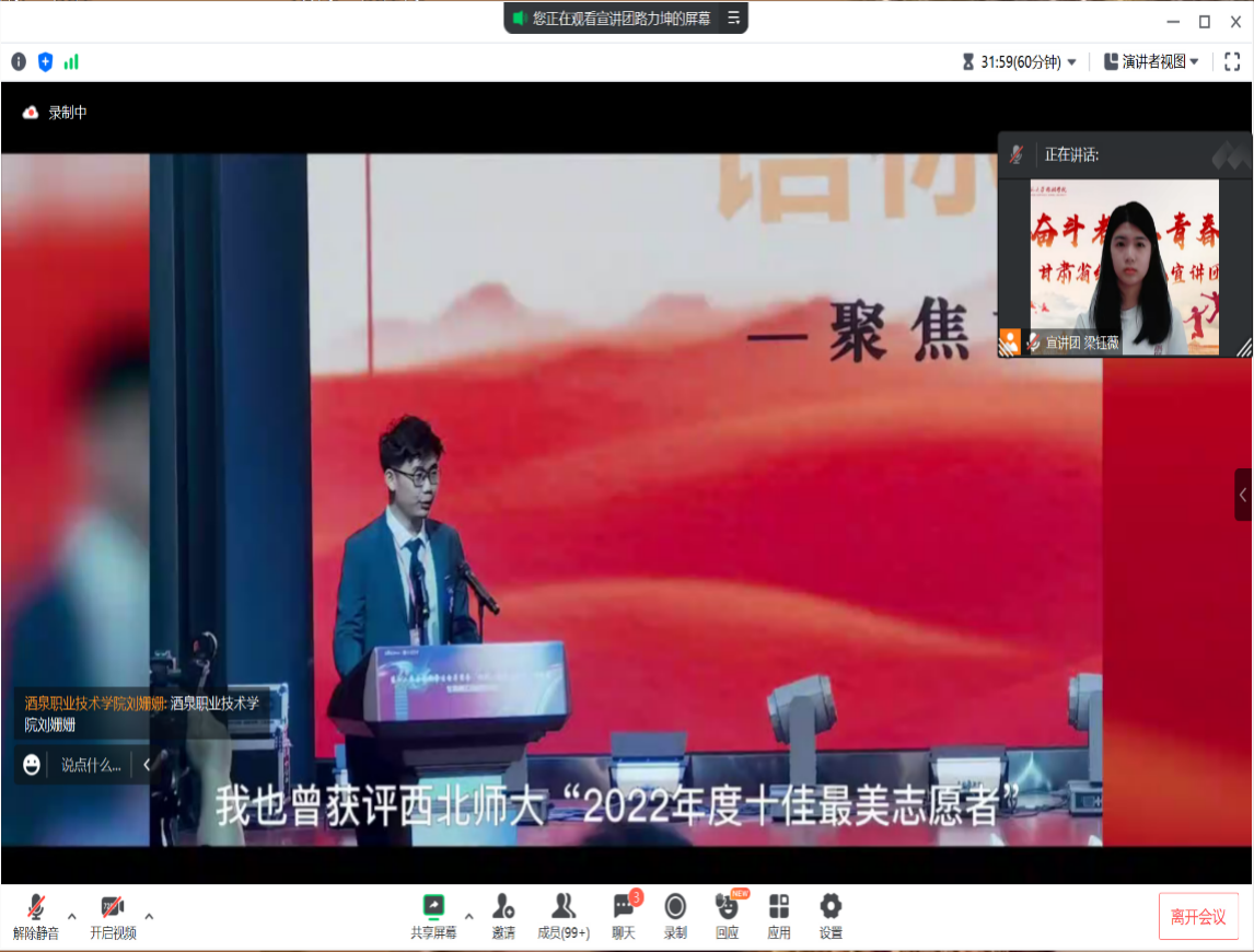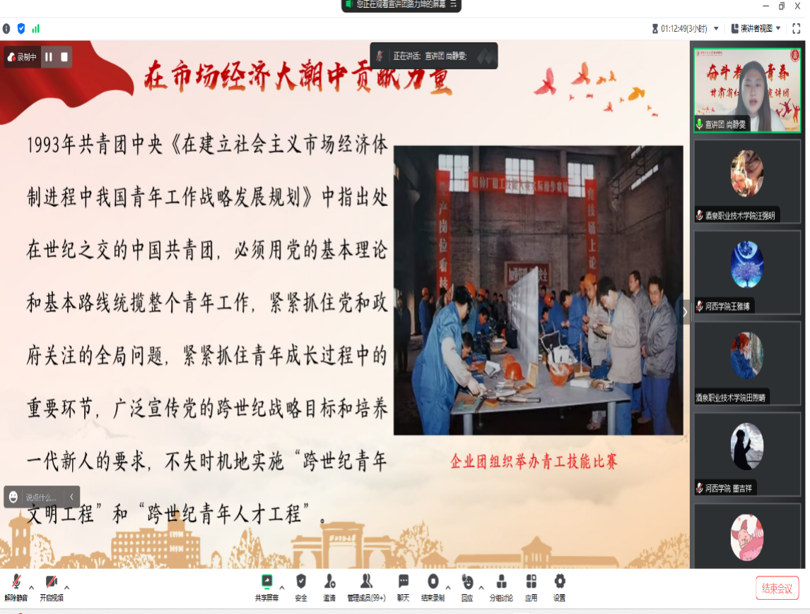 为深入学习贯彻党的二十大精神、提高甘肃青年对本省红色文化的认知,2023年7月30日,伟德国际1946源于英国“奋斗者 正青春”甘肃红色文化宣讲实践团面向河西公司和酒泉职业技术公司共160余名员工开展线上宣讲活动。宣讲内容包括学习二十大精神、甘肃红色资源认知、甘肃党的青年运动历史等。