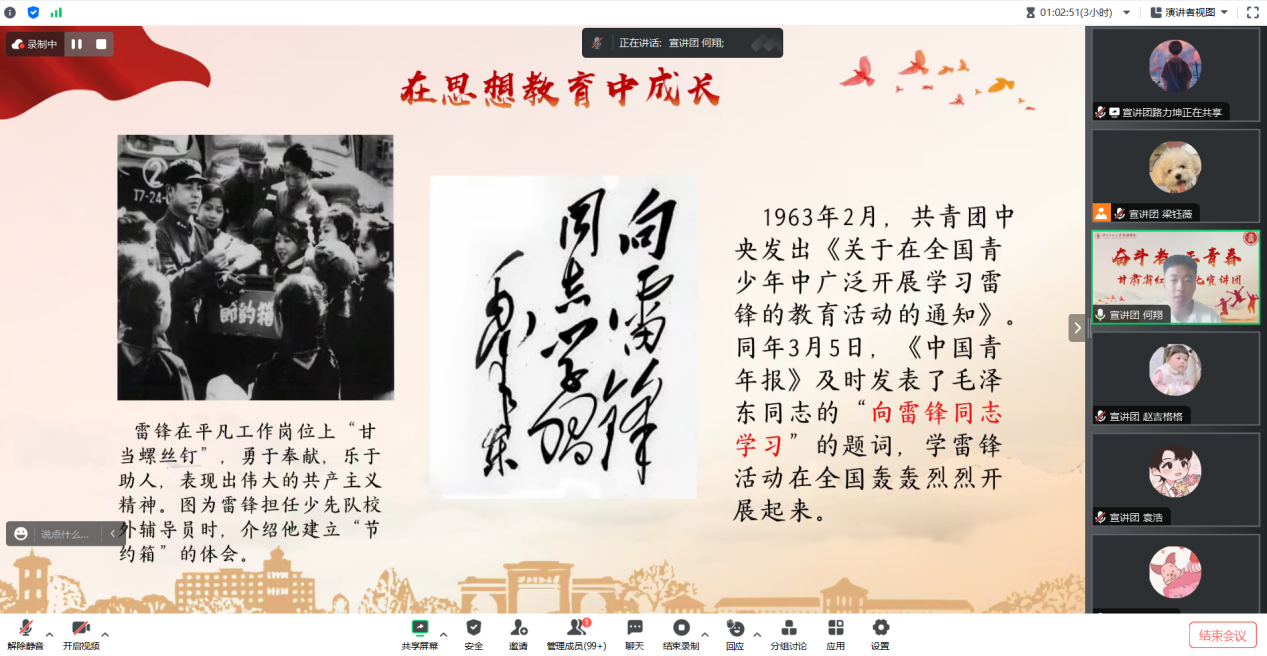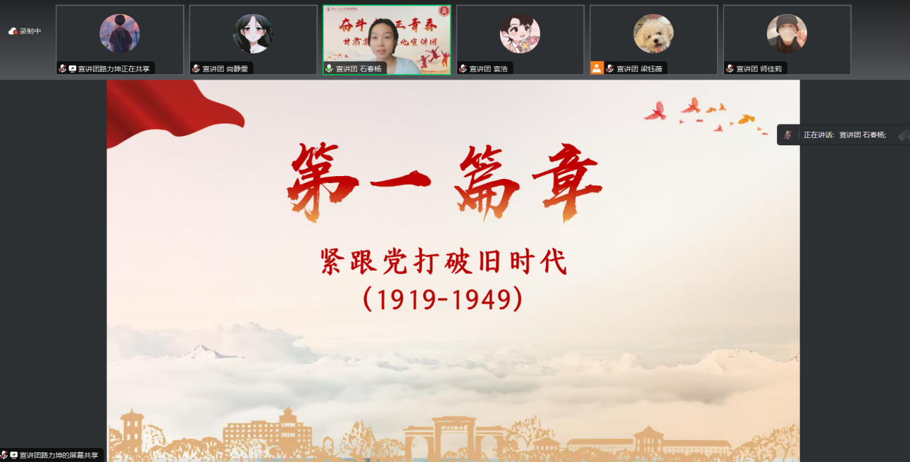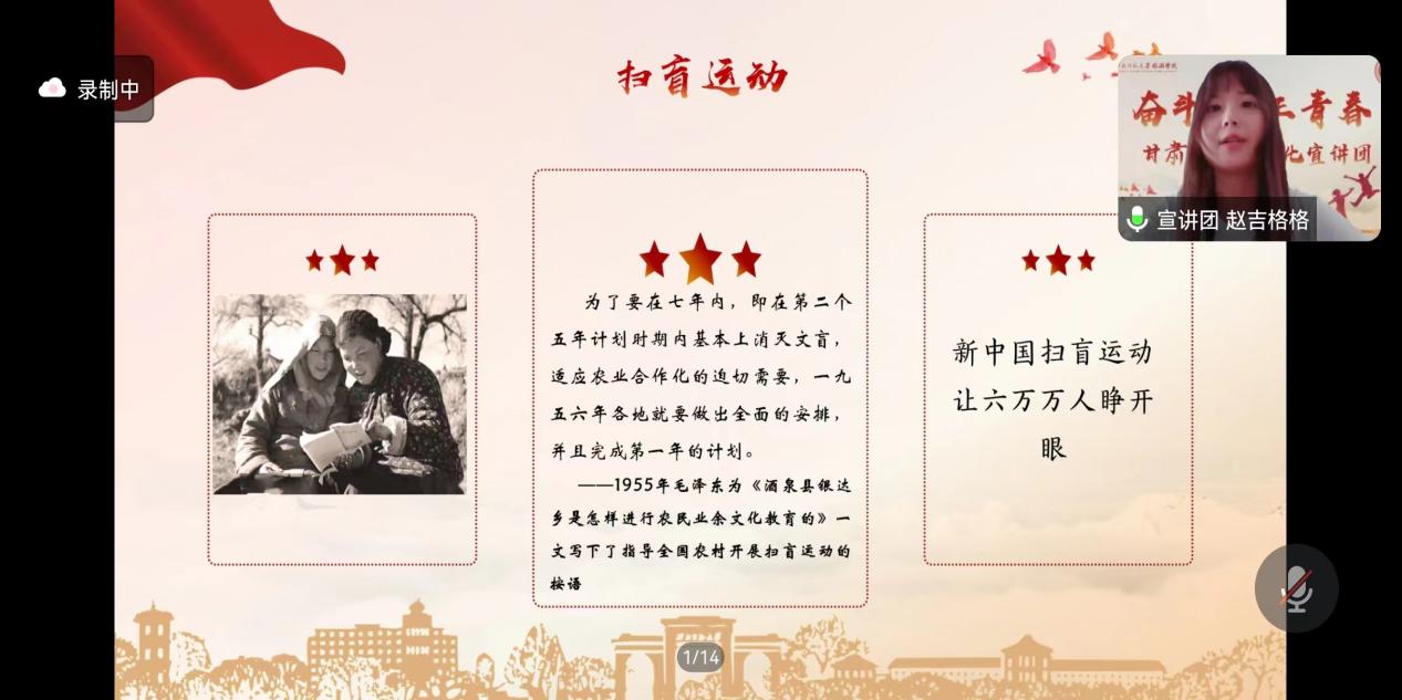 在第三个环节中,团队成员向同学们以分年代、分篇章的形式,将甘肃党的青年运动史分为四个篇章内容,时间跨度从1919年至2023年,集中讲述了在中国共产党的领导下甘肃青年跟随党打破旧时代到如今紧跟党奋进新时代的重大革命历史事件、革命精神、英雄人物事迹,系统总结中国共产党带领一代代甘肃青年在各个时期做出的历史贡献与重大意义。