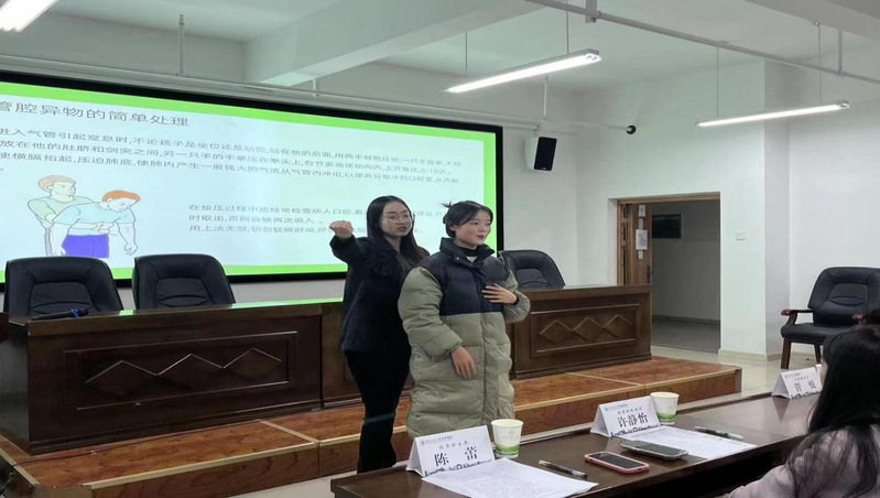 大会第五项由优秀志愿者田昕进行校园急救知识培训,通过亲自示范急救方法,从常见急症的处理、官腔异物的简单处理、抽搐的初步处理和外伤的简单处理等方面,为同学们进行初步培训,帮助同学们了解急救知识。