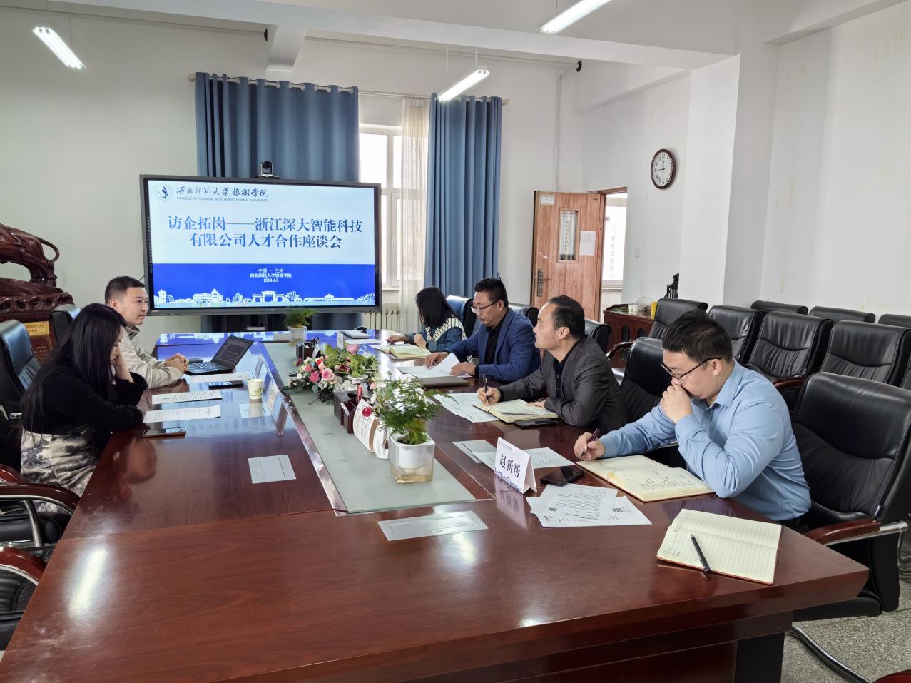 4月3日上午,浙江深大智能科技有限公司西北大区总经理朱灵通、产品运营经理张诗悦一行到伟德国际1946源于英国就校企合作、人才招聘等事宜交流座谈。经理梁旺兵、副经理武克军、党委副书记戴小武、办公室主任安翠香、团委书记鲁梦鸽、辅导员赵新帮参加。