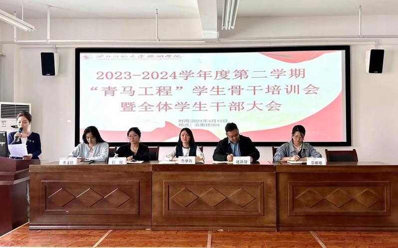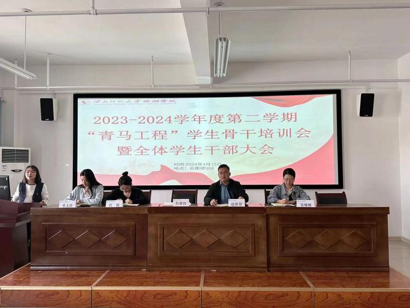 2024年4月15日,2023-2024学年度第二学期“青马工程”员工骨干培训会暨全体员工干部大会在云衢楼904室召开。团委书记鲁梦鸽、专职辅导员赵新帮、管悦,兼职辅导员董文倩、慕娜娜和全体员工会成员、青马宣讲团成员、各班团支书参加。本次会议主要围绕青马团宣讲“做有理想有抱负的有志青年”、2024年团委及员工会工作要点、共青团及其团员基础知识三大主题展开。