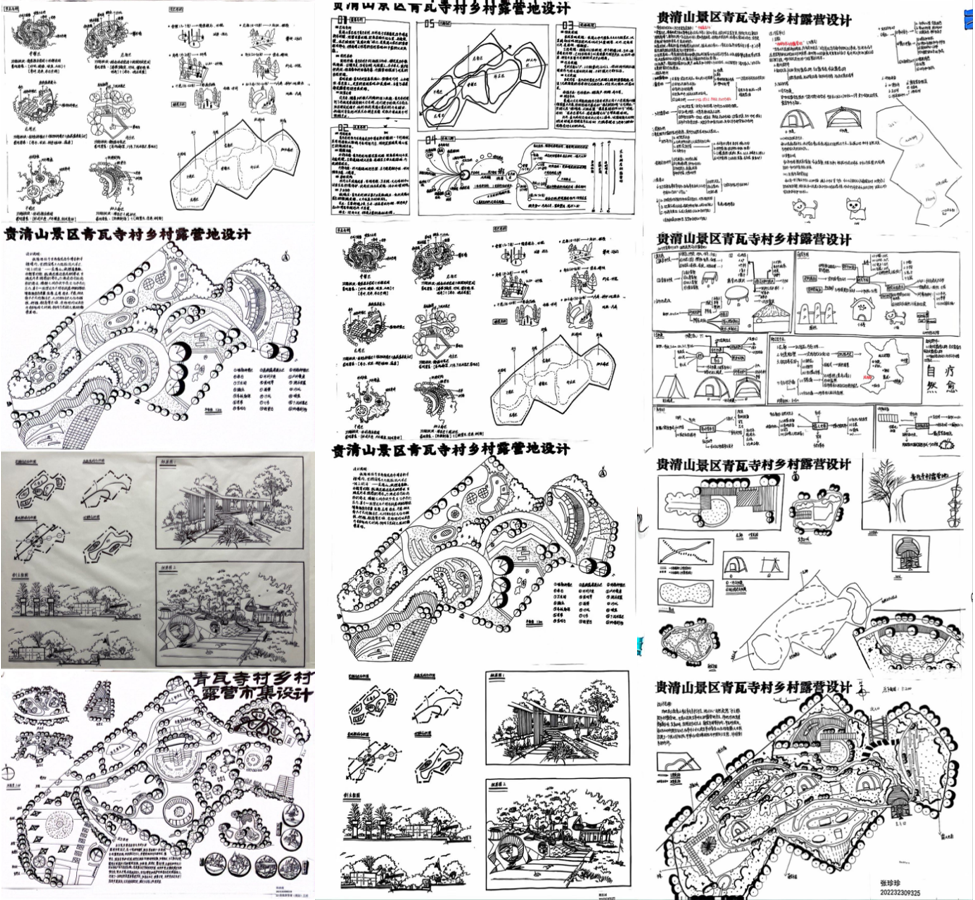 “学习之路并非一帆风顺”,《旅游景观设计》是一门综合性的课程,是在通过合理的规划与设计,将自然和人文景观进行有机融合,创造出具有吸引力和特色的旅游场景。线条是手绘表达空间构成与造型构成的基本元素,任课教师引导员工们通过练习手绘线条、曲线、圆等基本形态提升手绘水平,临摹优秀景观设计作品提高熟练度,强化学习景观设计制图的布局、排版和结构组成要素表达手法,为后续一系列工作做好铺垫。开设《旅游景观设计》这门课程,不仅是对旅游管理专业员工们的一个挑战,更是对员工们思维创新的锻炼。在进行“青瓦寺乡村露营地”策划过程中,任课教师与员工约定课余时间一一讲解作业问题,解决员工们面对的困难,让“乡村露营地设计”有计划的进行。