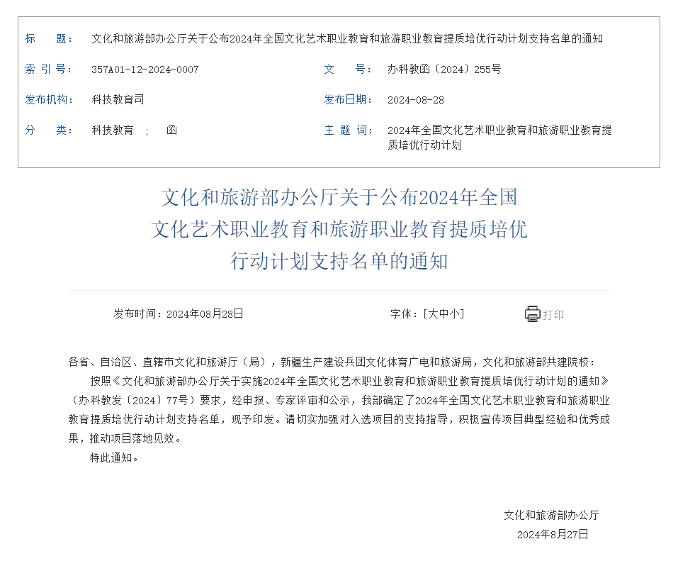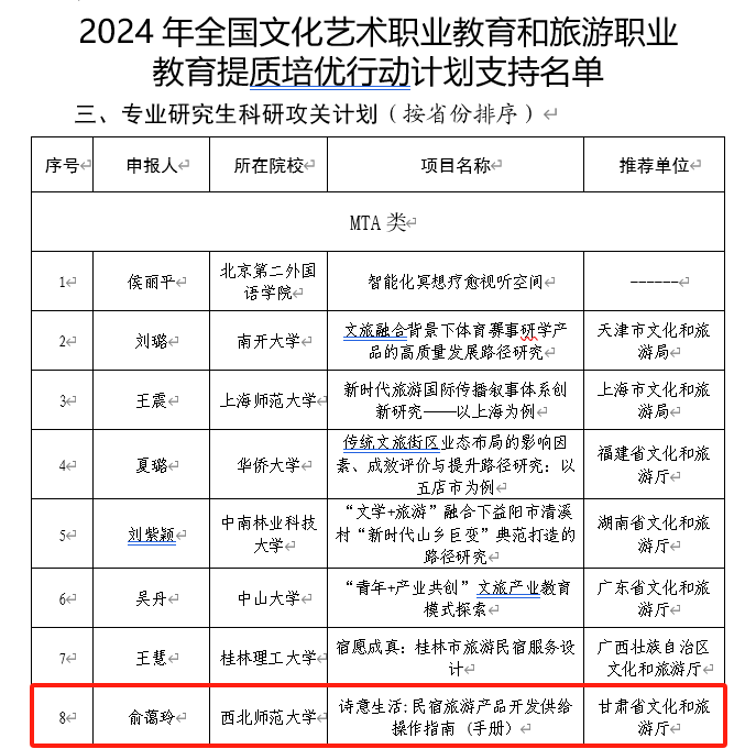 8月27日,国家文化和旅游部公布了2024年全国文化艺术职业教育和旅游职业教育提质培优行动计划支持名单,公司2023级全日制MTA员工俞蔼玲的《诗意生活:民宿旅游产品开发供给操作指南(手册)》项目入选专业研究生(MTA)科研攻关计划。