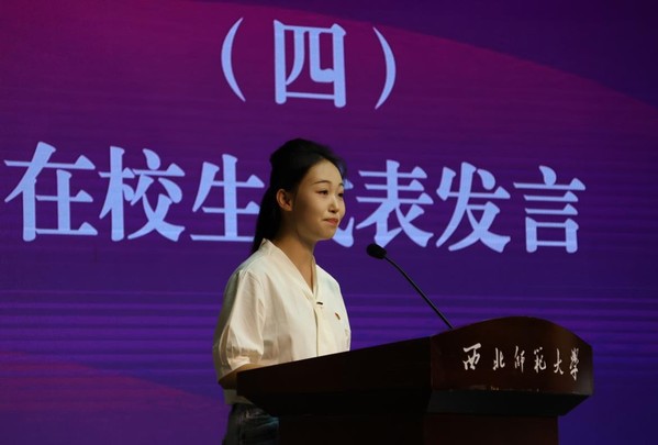 在校生代表张紫祎从自身的经历出发,讲述了她在大学期间的成长规划,并鼓励新同学们珍惜大学时光,努力学习,积极参与社会实践和志愿服务,做到“无悔青春”。