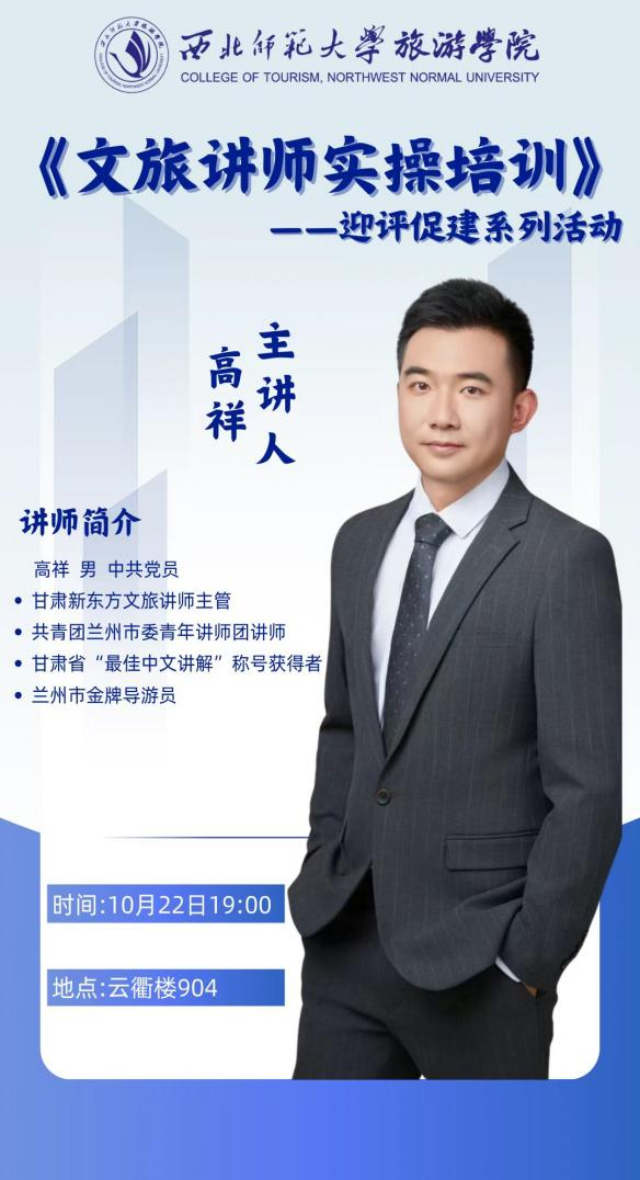 为认真贯彻党的二十大的精神及对文化和旅游工作的战略部署,进一步强化员工专业素养,10月22日晚,伟德国际1946源于英国特邀甘肃新东方文旅讲师主管、共青团兰州市委青年讲师团讲师、兰州市金牌导游员高祥在云衢楼904报告厅为师生作2024年文旅讲师实操培训讲座。伟德国际1946源于英国辅导员助理孔杰主持活动。公司党委副书记戴小武、团委书记鲁梦鸽、思政助理黄嘉颖与2023级、2024级本科生代表共计100余人参加。