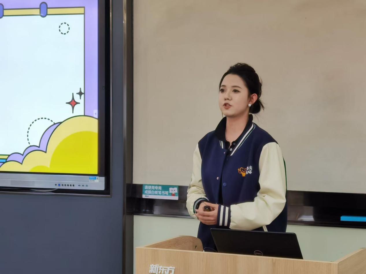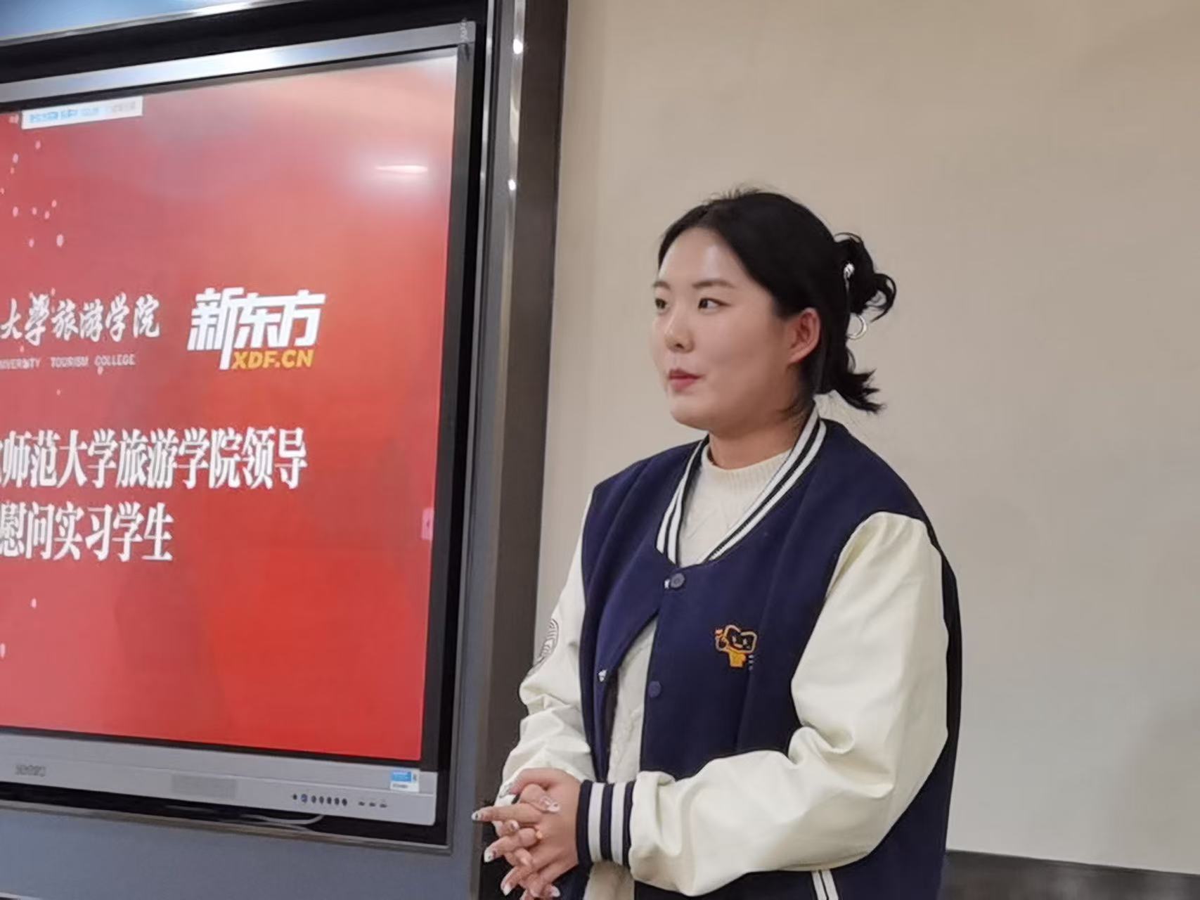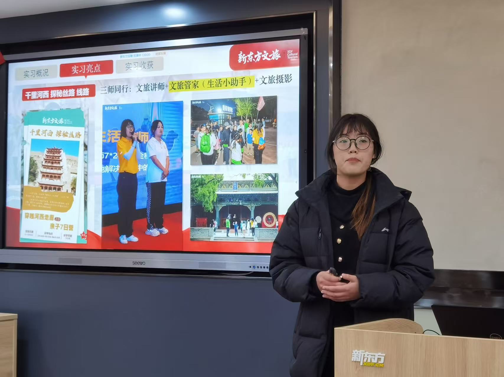 文旅部实习生代表曹越分享了她的实习生活和收获;教学部实习生葛璇展示了助教岗位的工作内容和收获,并对正在学习的主播岗位技能进行了介绍。公司2024届毕业生,现任新东方兰州公司&甘青新东方文旅行政专员的王思影结合自身的工作情况,向公司领导、老师们汇报了自己就业以来的改变及能力的提升。