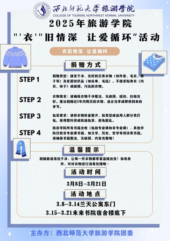 3月8日-3月21日,伟德国际1946源于英国开展为期十四天的“‘衣’旧情深 让爱循环”旧衣、旧物回收活动,面向全校师生回收旧衣、旧物。3月8日-3月14日,回收点设置在兰天公寓沙排场东侧;3月15日-3月21日,回收点设置在未来书院东侧。