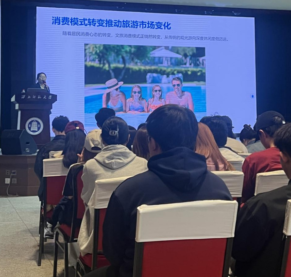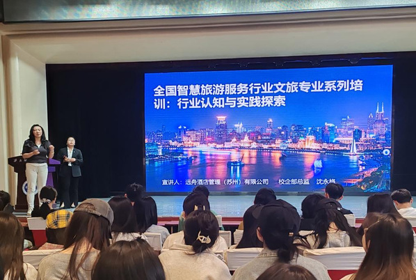 2025年4月17日下午,应公司邀请,远舟酒店管理(苏州)有限公司校企部总监沈永格在员工发展中心202为2023级旅游管理专业全体同学及2022级航空服务艺术与管理专业部分同学进行了实习生项目的宣讲。