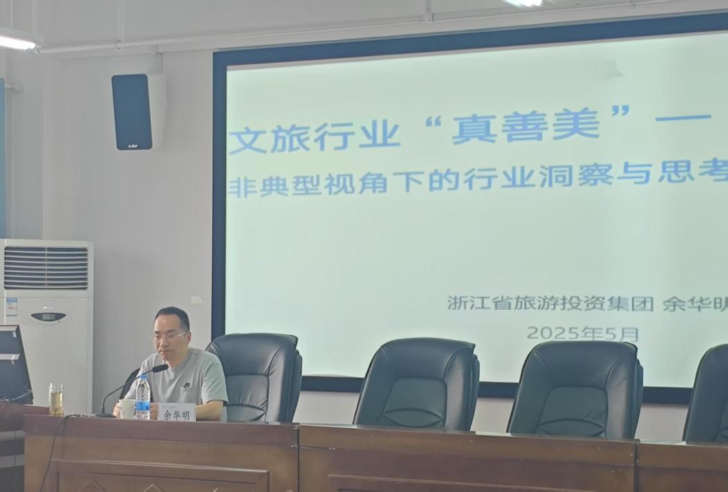2025年5月16日下午,浙江省旅游投资集团资产管理部余华明总经理,应邀为公司师生带来了一场题为《“文旅行业‘真善美’--非典型视角下的行业洞察与思考》的专题学术报告,公司相关专业教师、研一全体员工和部分本科生听取报告。报告会由杨阿莉教授主持。