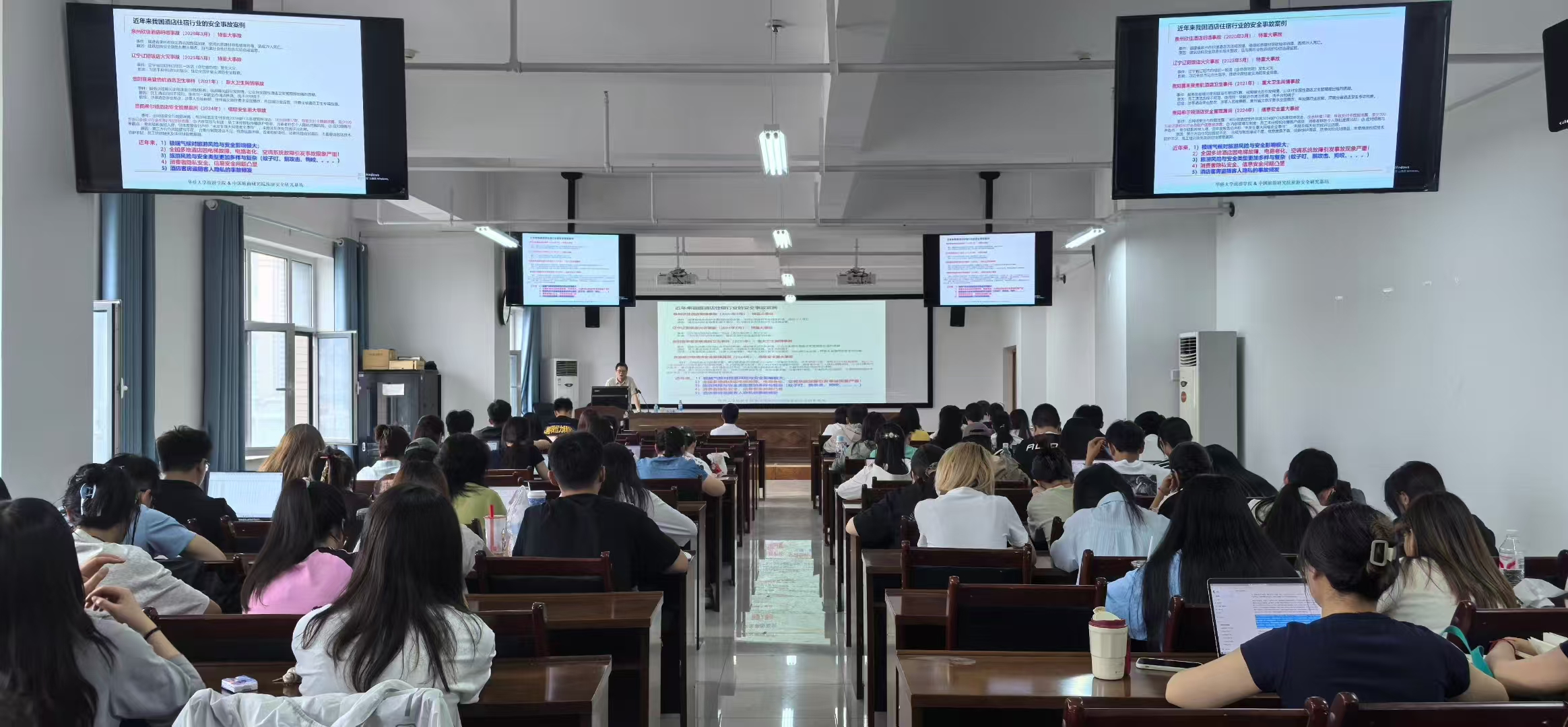 面对新挑战,郑向敏教授向师生们分享了“大旅游治理体系”,重点阐述多元协同的安全保障机制构建,包括政府强化监管标准与应急能力、企业落实安全主体资任、行业组织推动自律与信息共享和游客提升风险意识和自护能力。深入探讨如何利用大数据、人工智能等技术建立风险预警与监测体系,强调全过程风险管理。最终落脚于通过系统性防范与保障,为游客提供既安全可靠又深度满意的品质旅游体验,推动旅游业的高质量、可持续发展。
