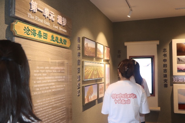 次日,团队深入八步沙林场,调研“两山”实践基地与六老汉治沙纪念馆。通过五个主题单元(遗梦、寻梦、追梦、筑梦、圆梦)的实物展陈,系统梳理了以“六老汉”为代表的三代治沙人38年接力奋斗的艰辛历程。团队成员实地考察草方格压沙、梭梭种植等治沙技术,理解“绿水青山就是金山银山”理念如何从理论转化为古浪的生态脱贫实践。值得一提的是,团队与中国民航大学实践团就生态治理与绿色发展展开跨学科交流,碰撞出文旅融合与生态教育的新思路。