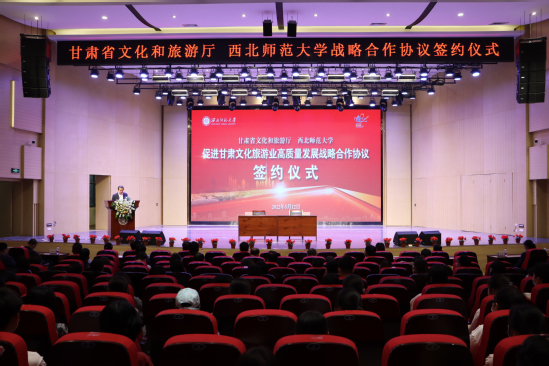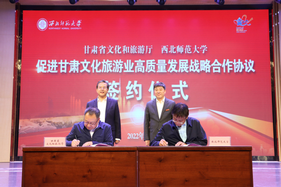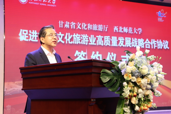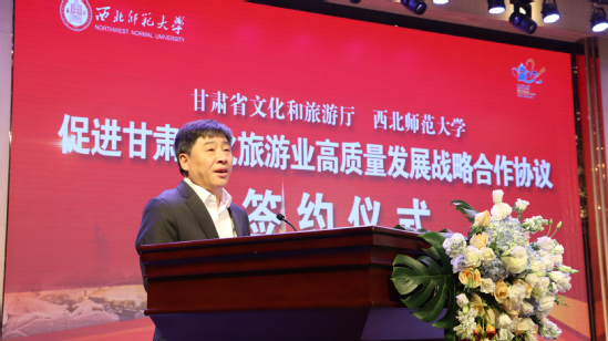 陈卫中在致辞中表示,“知术欲圆,行旨须直”,是西北师大办学育人的校训准则,体现了师大的历史积淀和文化追求。“定了就干、马上就办”,是甘肃文旅人干事创业打硬仗的一贯作风。此次省文旅厅和西北师大开展战略合作,搭建文旅教育融合发展平台,既是贯彻落实习近平总书记关于文化旅游、教育重要论述精神的实际行动,也是贯彻落实省委省政府“四强”战略及建设文化旅游强省重要部署的具体举措,具有重要而深远的意义,必将开启政校合作、教育赋能文旅的新篇章。希望以此次协议签署为基础,进一步发挥西北师大人才智库作用,和省文旅厅共同挖掘政府部门和高等院校资源优势,深化合作、同向而行、同频发力,共同推动文化旅游和教育深度融合、高质量发展,更好地服务国家战略和全省社会经济发展,为加快建设幸福美好新甘肃、不断开创富民兴陇新局面贡献智慧和力量。